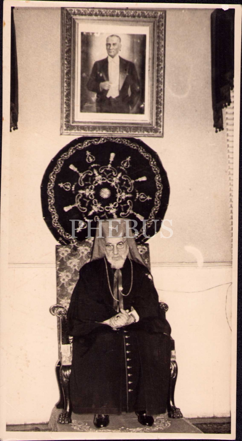Mustafa Kemal Atatürk portresi asılı duvar önünde poz veren Hristiyan din adamı