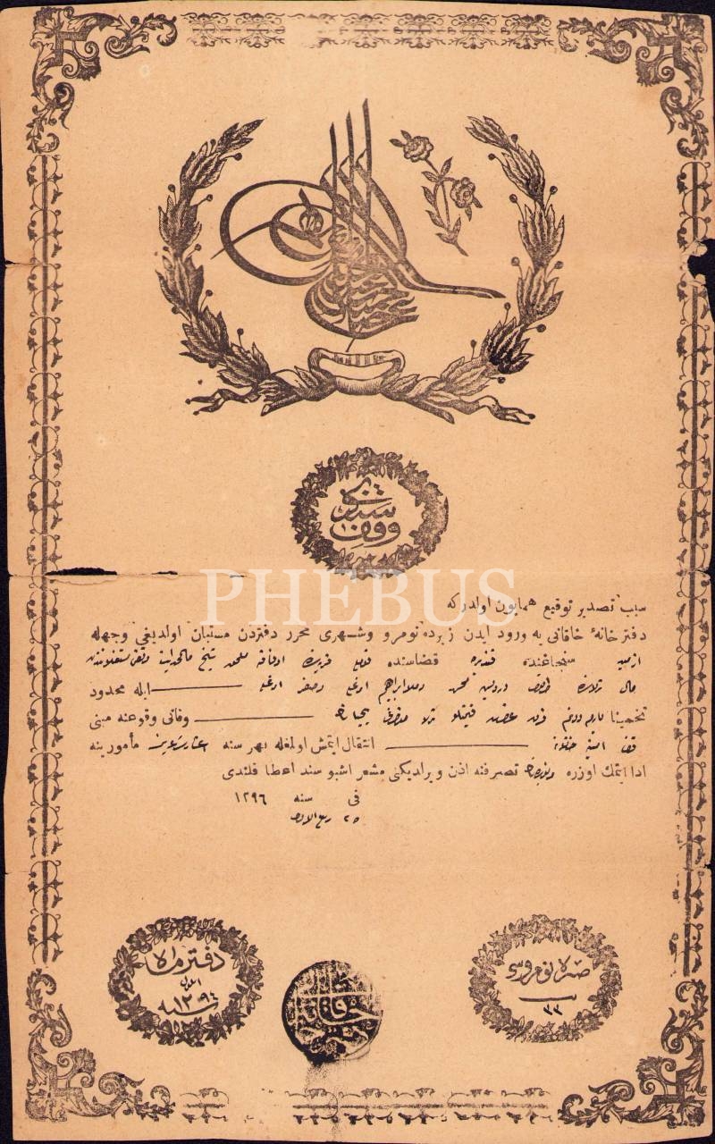 Osmanlıca 2 adet vakıf senedi, İzmit 1296, 17x28 cm, bir kenarı yırtık haliyle