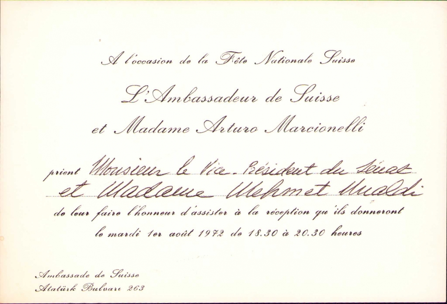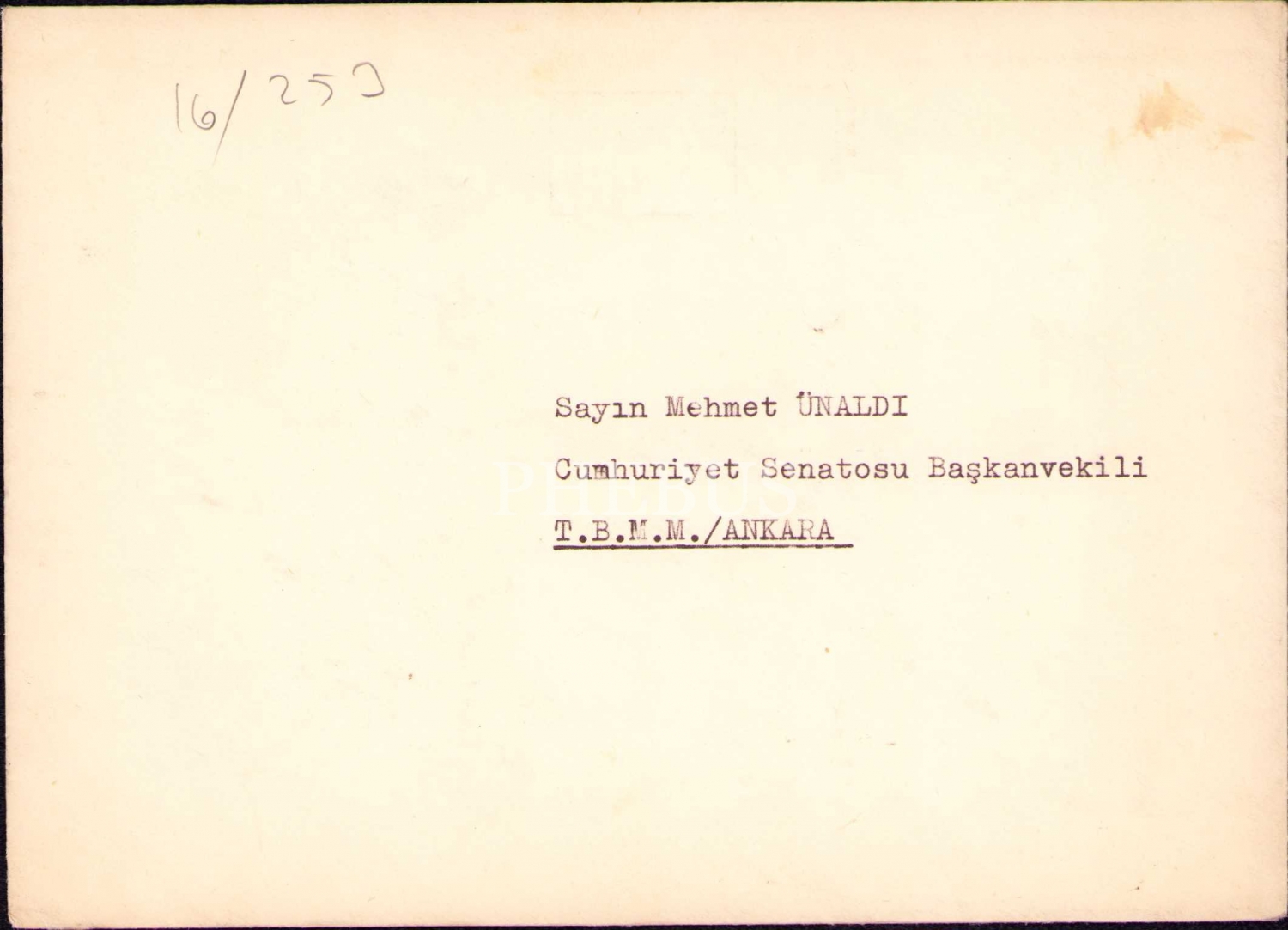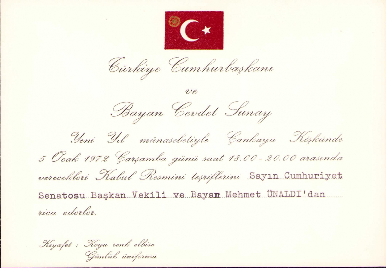 Türkçe ve Fransızca yeni yıl balosu davetiyesi ve zarfı, Cumhurbaşkanı Cevdet Sunay'dan Mehmet Ünaldı'ya, 12x17 cm