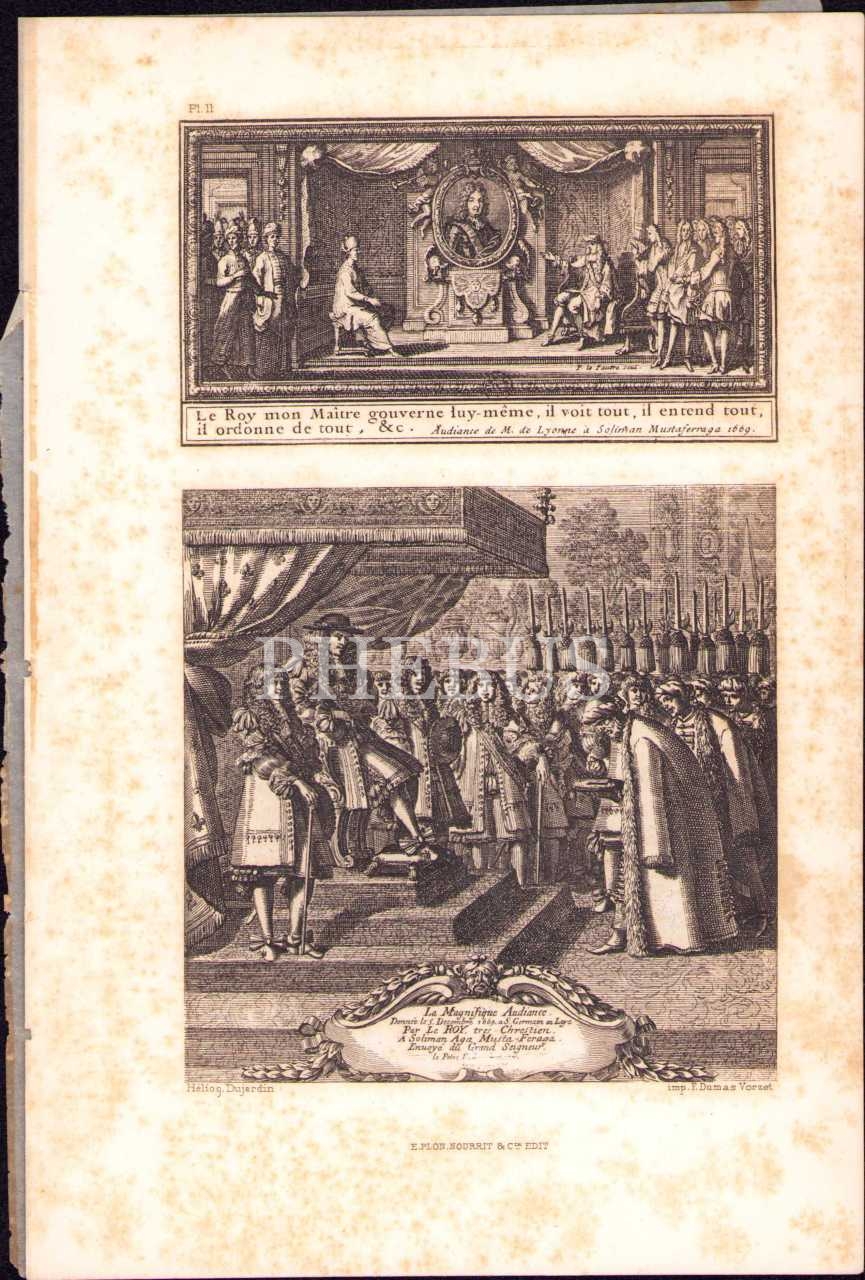 Fransa Kralı ve Osmanlı Elçisi Süleyman Ağa konulu gravür, F. Dumas Vorzet, 1669, 14x22 cm