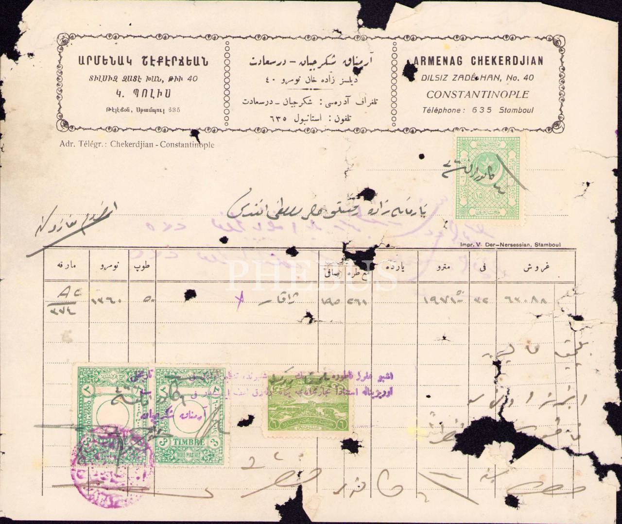 Osmanlıca-Ermenice Armenak Şekerciyan antetli fatura, İstanbul, epey yıpranmış haliyle