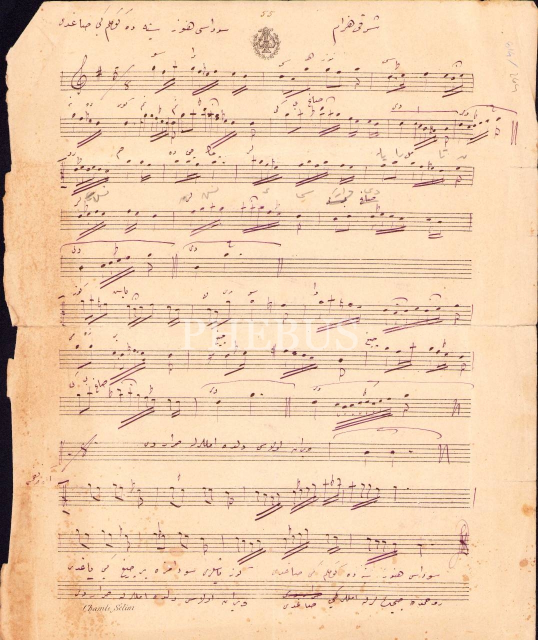 Osmanlıca el yazması hüzzam şarkı notası, 27x33 cm, kenarları yırtık haliyle