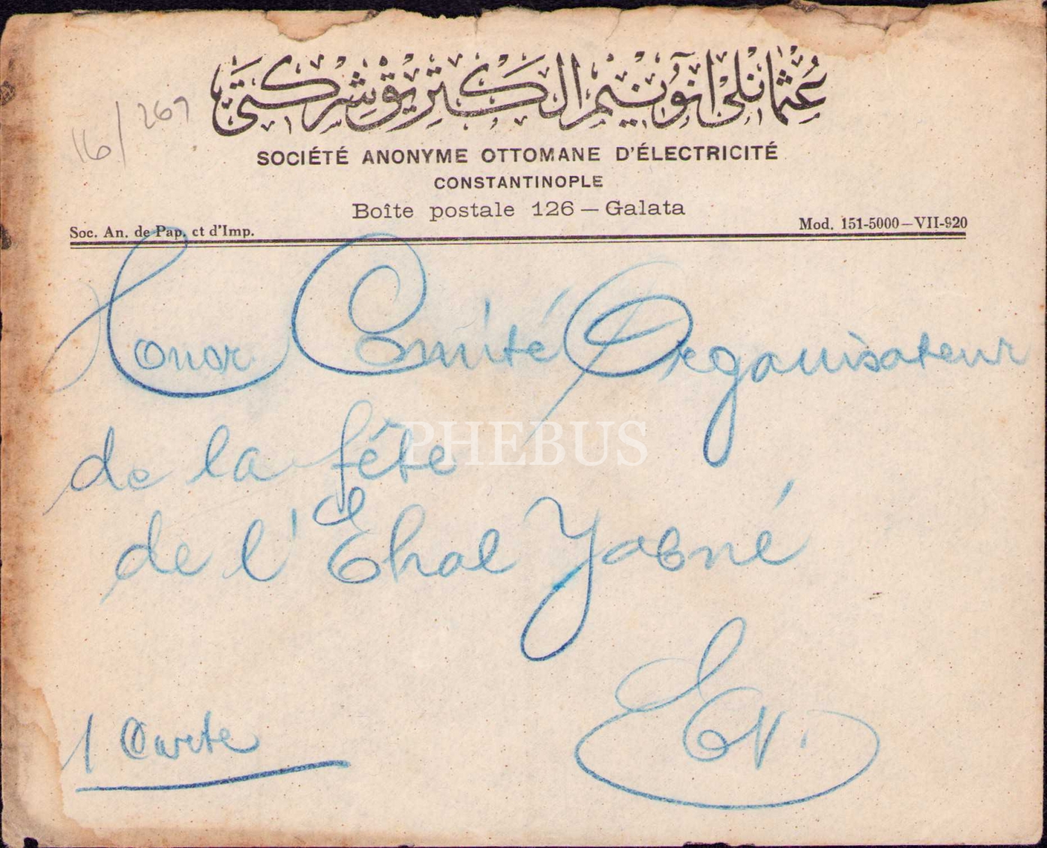 Osmanlı Anonim Elektrik Şirketi antetli zarf, 12x16 cm, üstten açılmış haliyle