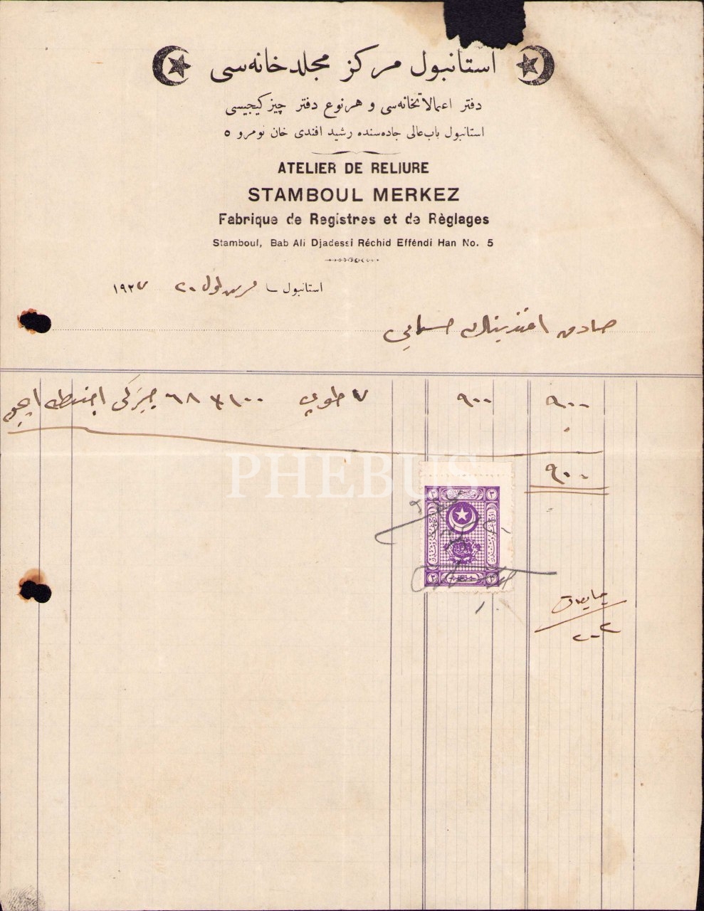 Osmanlıca-Fransızca İstanbul Merkez Mücellidhanesi antetli fatura, 1927, üst kenarı yırtık haliyle
