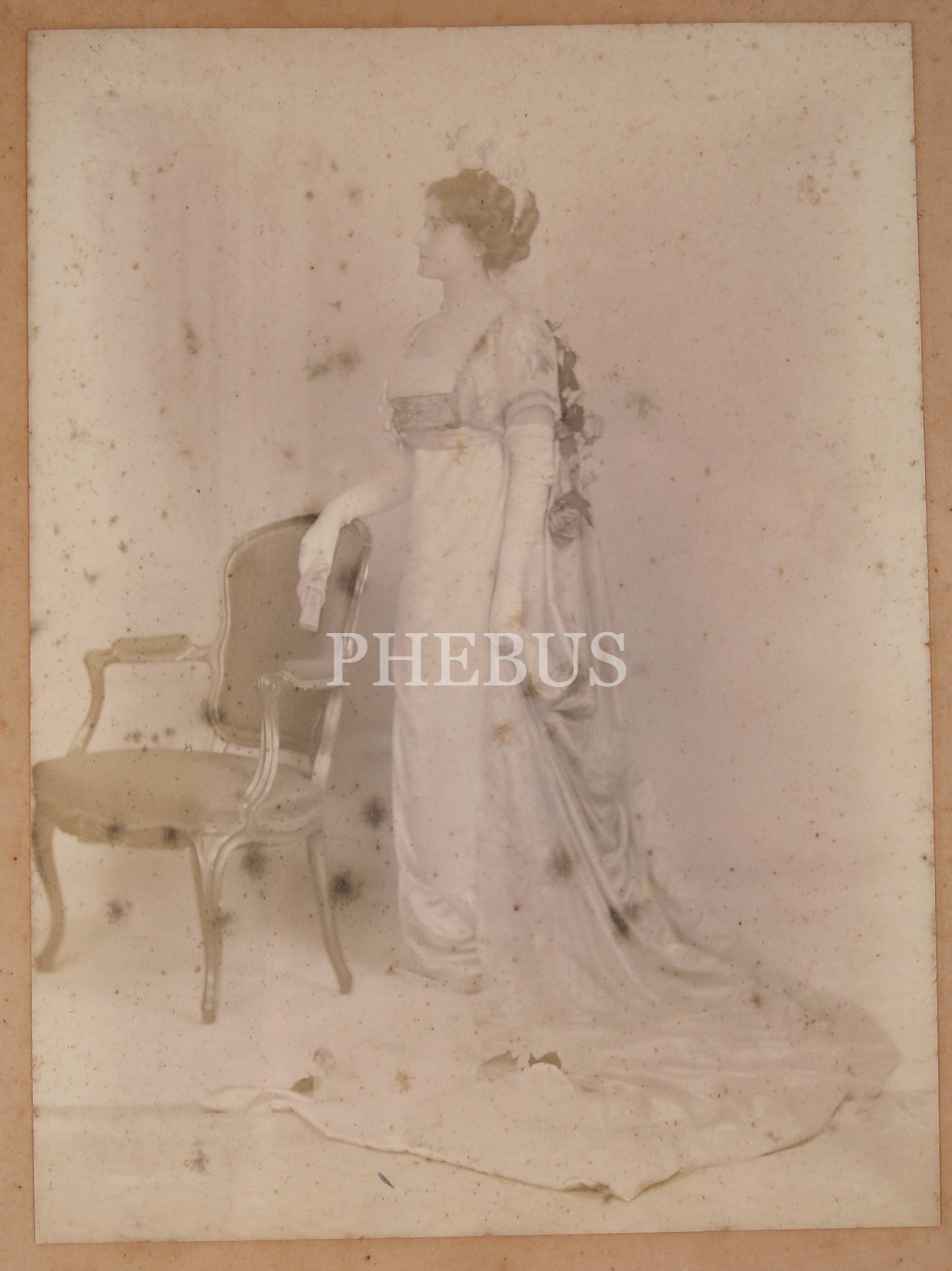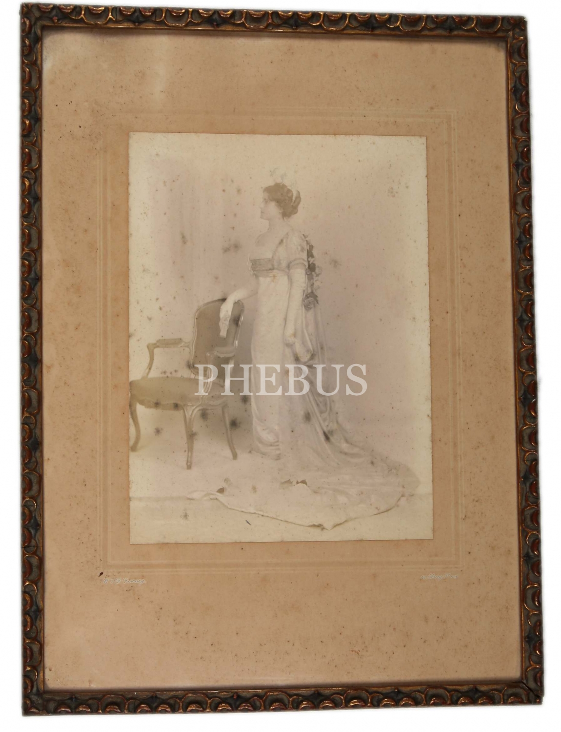 Modern hemşireliğin öncülerinden Safiye Elbi'nin gelinlikli fotoğrafı, çerçeveli, çervenin arkasında Çerçeveci Madam Moiz Baruh etiketi mevcut 25x34 cm