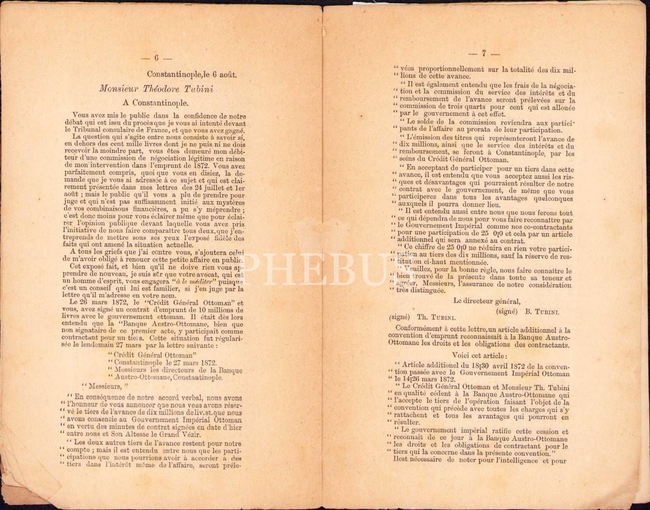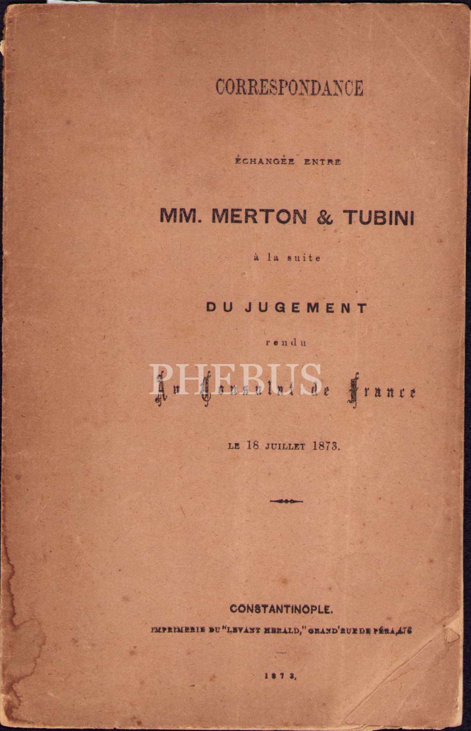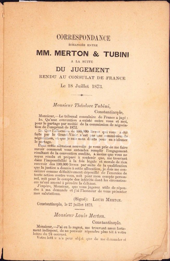 Latin Kökenli Tubini Ailesi ile Louis Merton Arasındaki Ticari Yazışmalar: Correspondance Echangee Entre MM. Merton&Tubini a la suite du Jugement rendu Au Consulat de France, Çok Nadir, 1873, Constantinople, Levant Herald Matbaası, 12 sayfa, 12x19 cm
