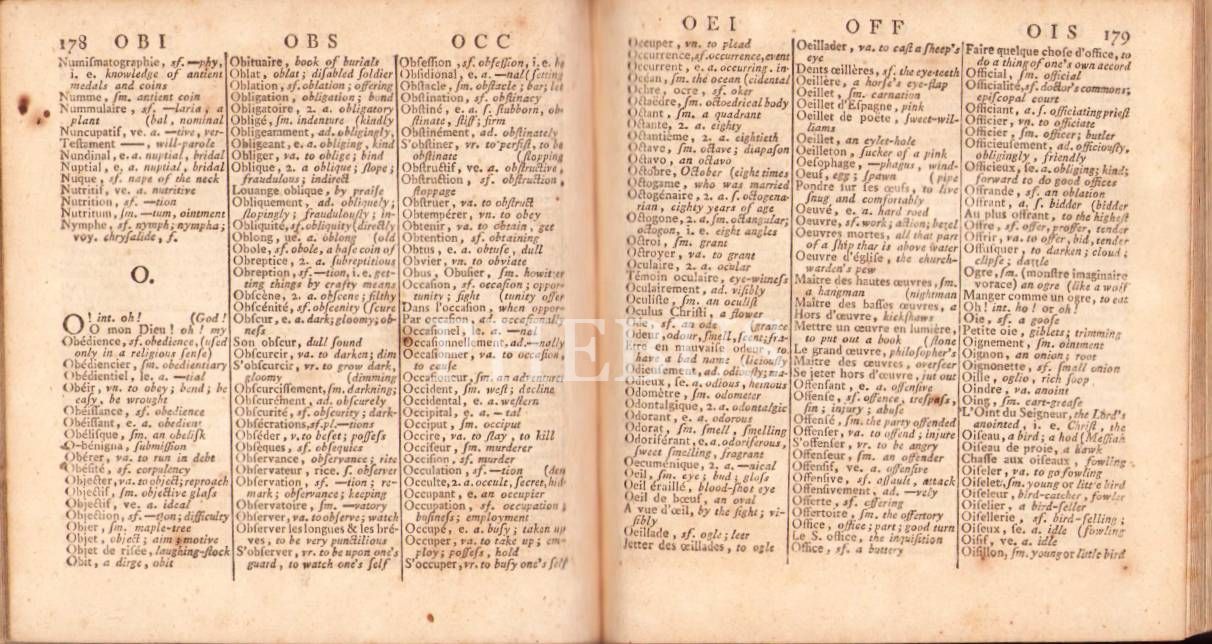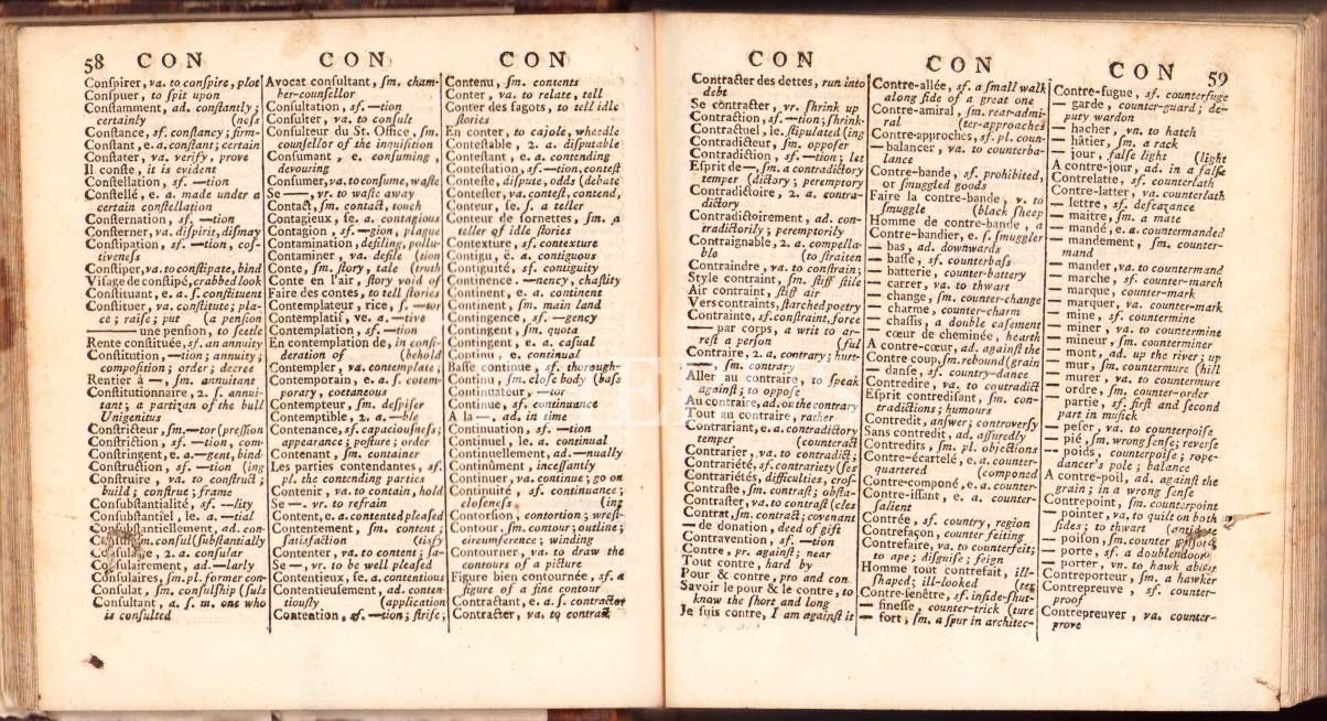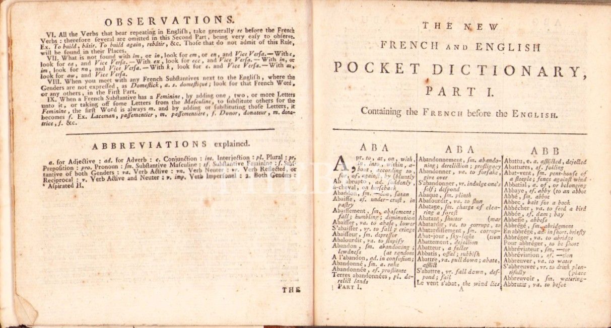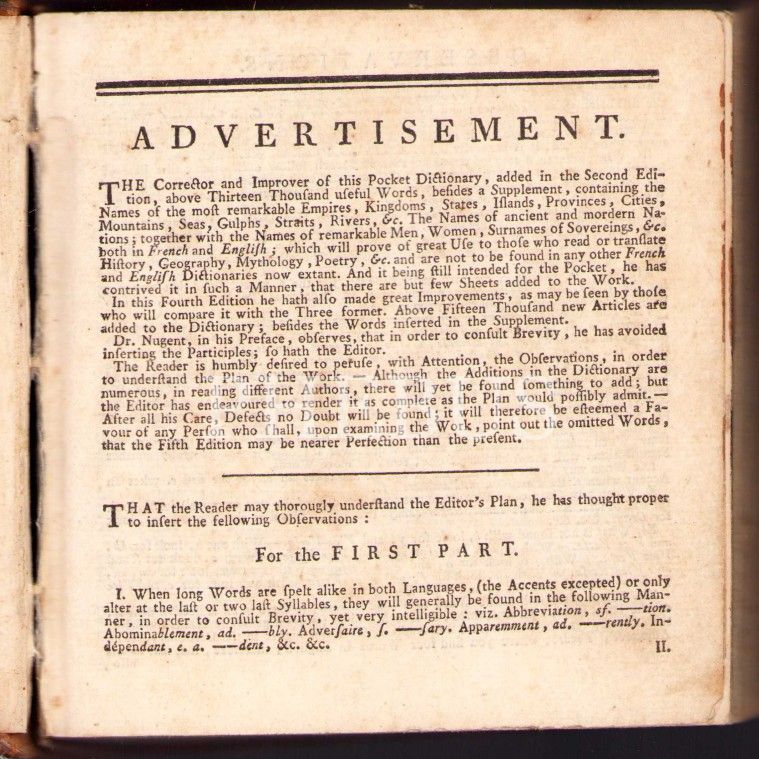 18. Yüzyıldan Bir Fransızca-İngilizce Cep Sözlüğü: The New French and English Pocket Dictionary, Thomas Nugent, Cilt 1, Londra, C. Dilly, 1784, 375+34 sayfa, künye sayfası eksik, 13x13 cm