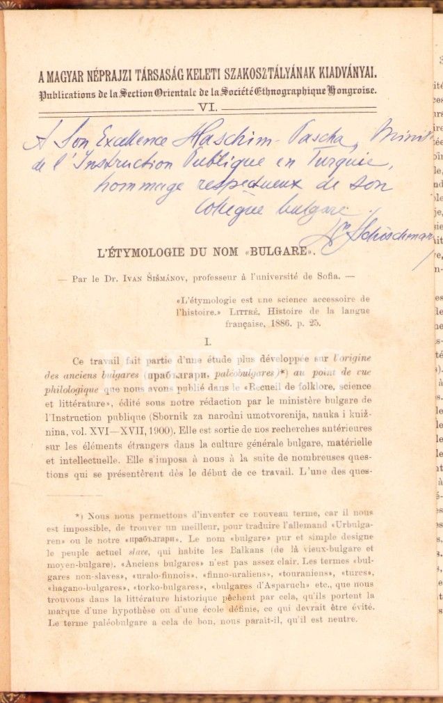 Yazarından Sultan Abdülhamid Han'ın Maarif Nazırı Haşim Paşa'ya İmzalı ve İthaflı Bir Bulgarca Etimolojisi: L'Etymologie Du Nome Bulgare, Le Dr Ivan Schischmanoff, süslemeli cildinde, altın yaldızlı, Fransızca, 90 sayfa, 15x22,5 cm