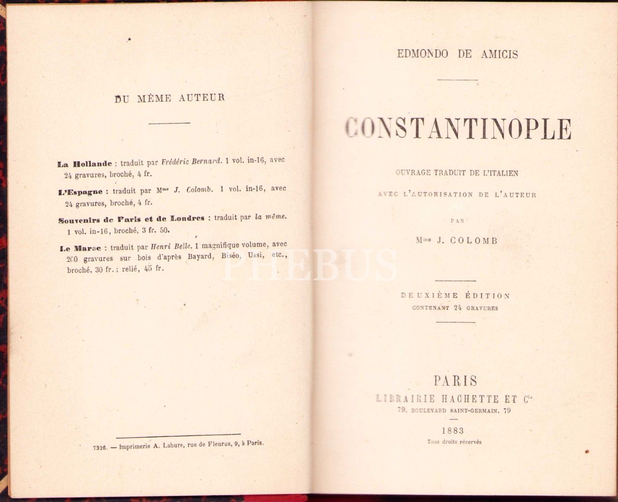 Meşhur İtalyan Yazar Edmondo de Amicis'in 1874 Yılındaki İstanbul Seyahati: Constantinople, J. Colomb'un Fransızca Tercümesi, 1883, Paris, 394 sayfa, 24 adet gravür mevcut, 12x18 cm