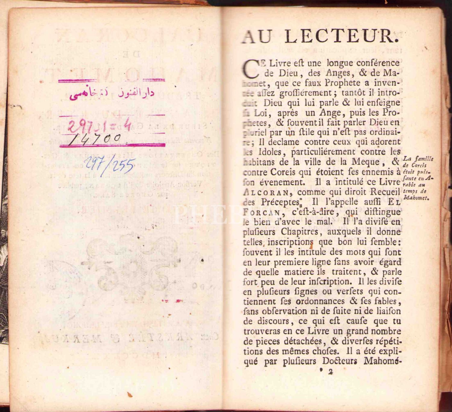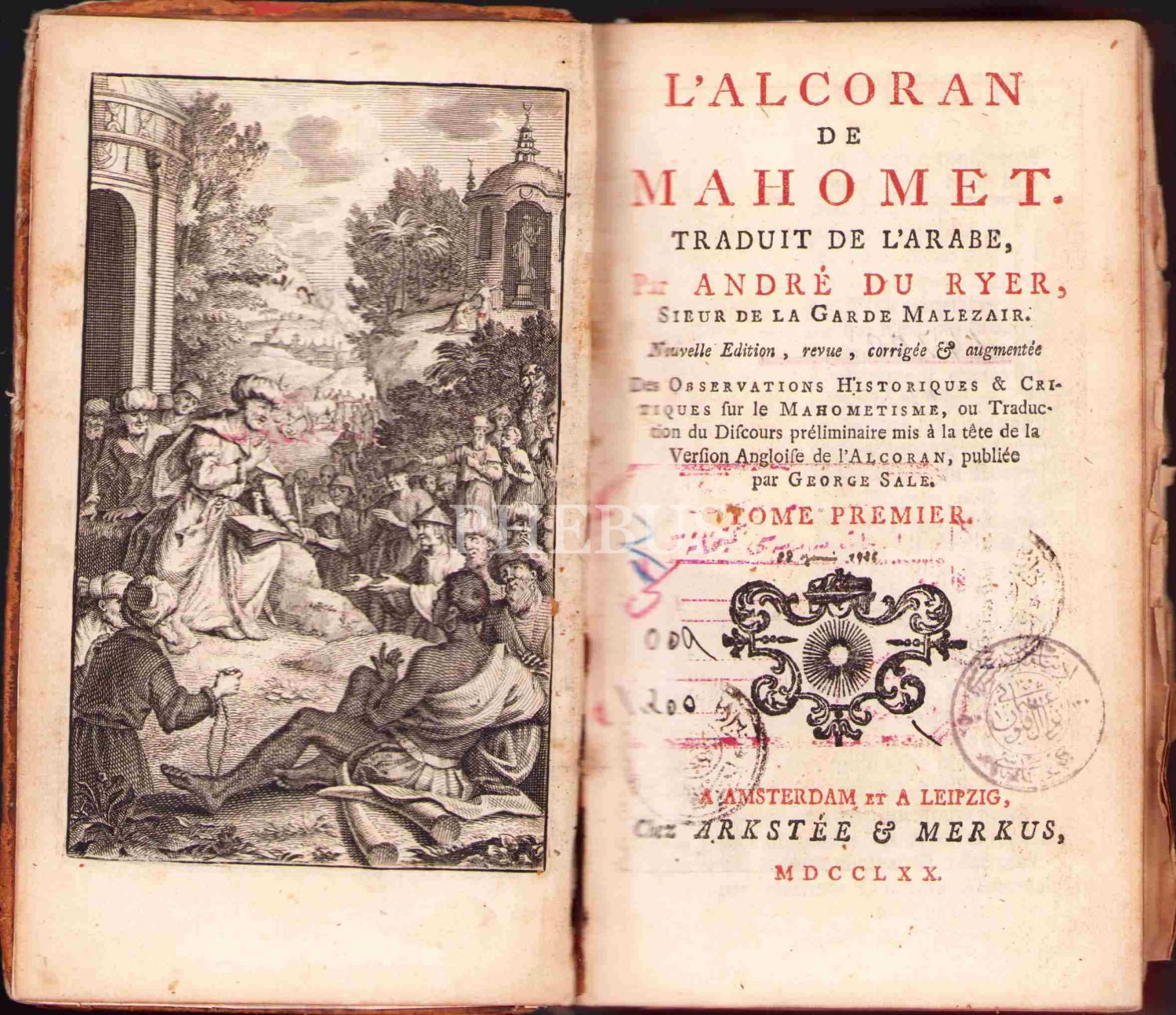 İlk Fransızca Kuran Tercümesi'nin 1770 Tarihli Baskısının İlk Cildi: "L'Alcoran de Mahomet", Andre du Ryer, 472 sayfa, cildi haliyle, 10x17 cm