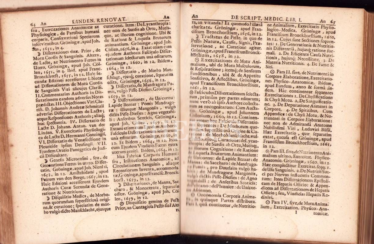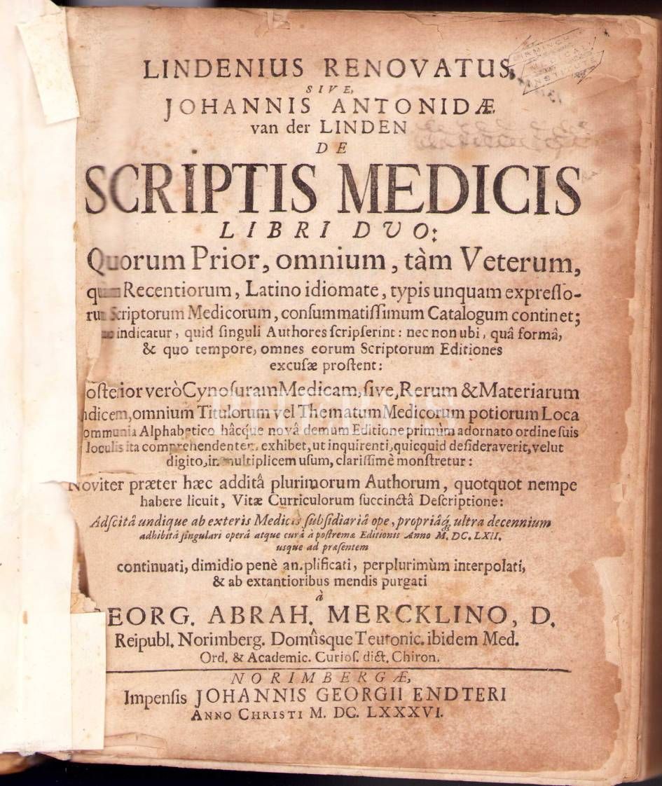 17. Yüzyılın En Kapsamlı Tıp Bibliyografyalarından Biri: Lindenius renovatus sive Johannis Antonidae Van der Linden De Scriptis Medicis libri duo 1686 tarihli, Norimbergae, Johannis Georgii Endteri, 1097 sayfa, 17x22 cm