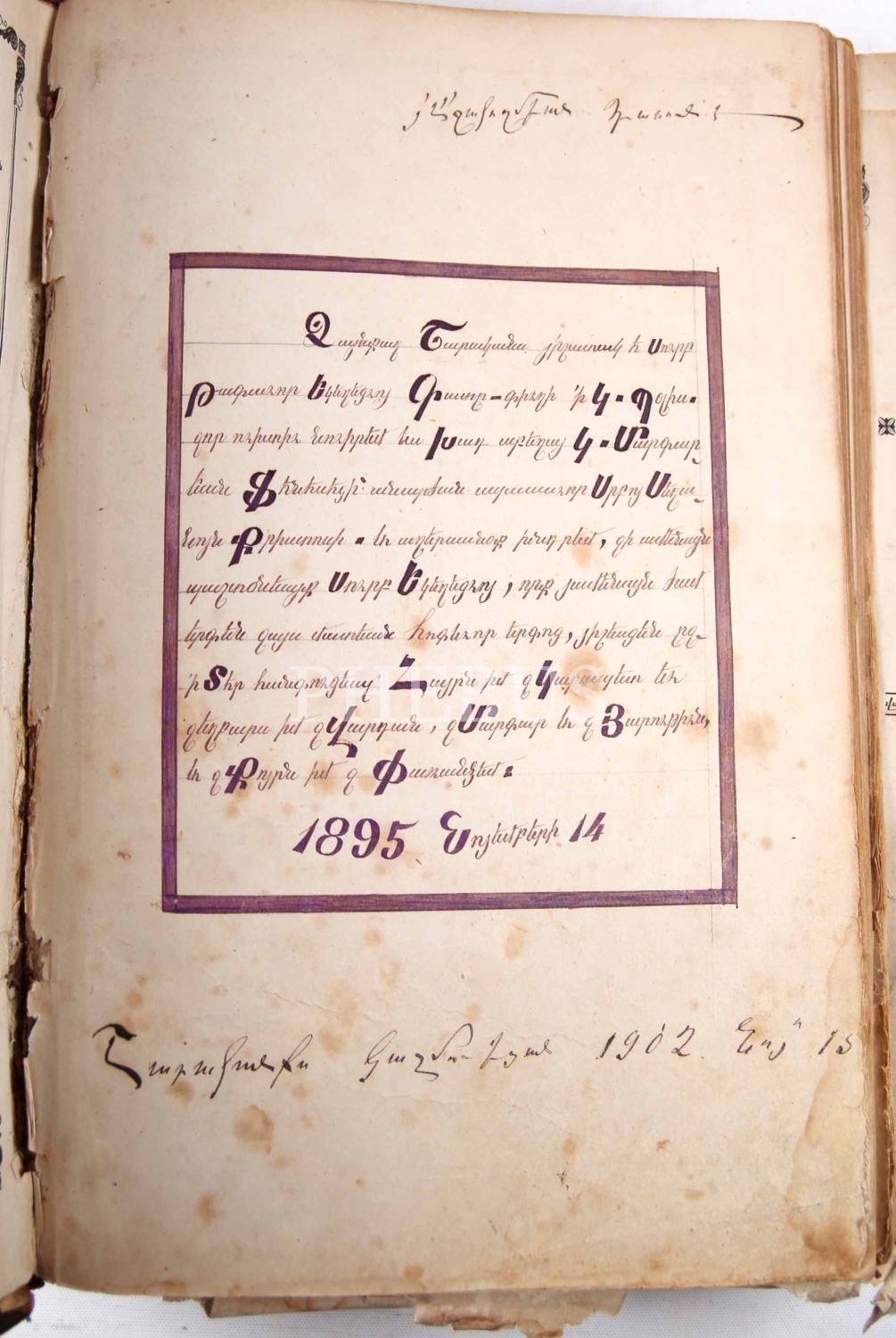 Bu kitap Rahip G. Markaryan tarafından rahmetli babası Garabed ve kardeşleri Vartan, Markar, Harutyun ve kız kardeşi Parantsem adına 14 Kasım 1895'de Kadıköy'deki Surp Takavor Ermeni Kilisesi'ne hediye edilmiştir. 13 Kasım 1902 koro tarafından kullanılmaya devam etmiştir.