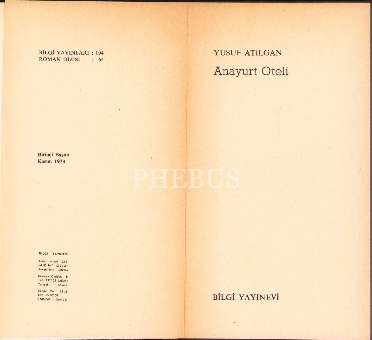 Yusuf Atılgan'ın İkinci Romanı "Anayurt Oteli", İlk Baskı, Bilgi Yayınevi, 1973