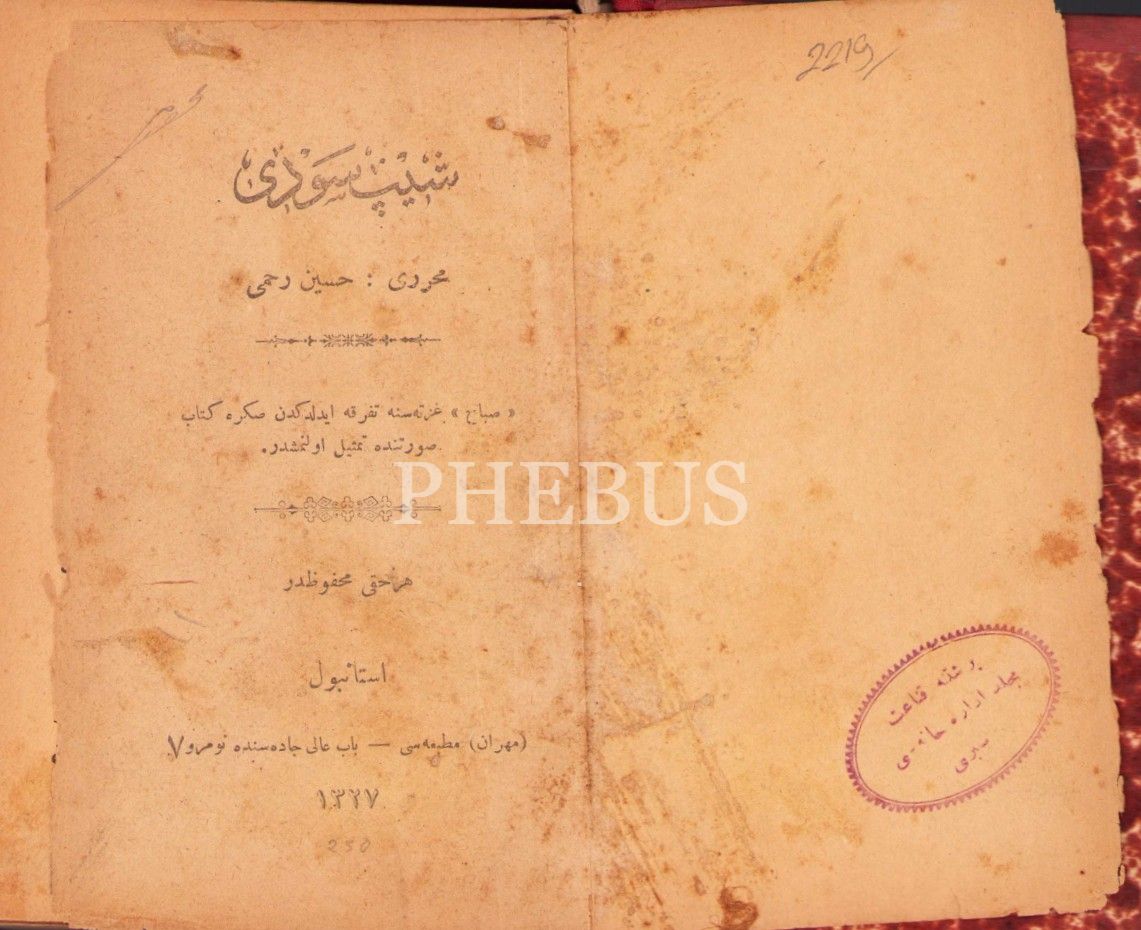 Ay yıldızlı ve Tuğralı Cildinde Osmanlıca Şıpsevdi, Hüseyin Rahmi Gürpınar, Mihran Matbaası, İstanbul 1327, 934 sayfa, 11x18 cm, ÖZEGE; 18944, cildin sırtı haliyledir
