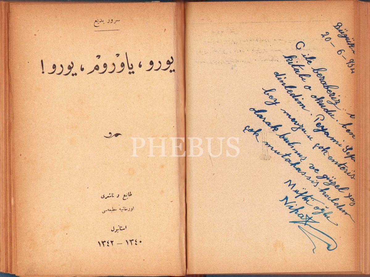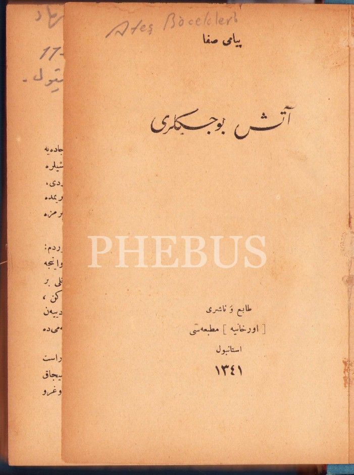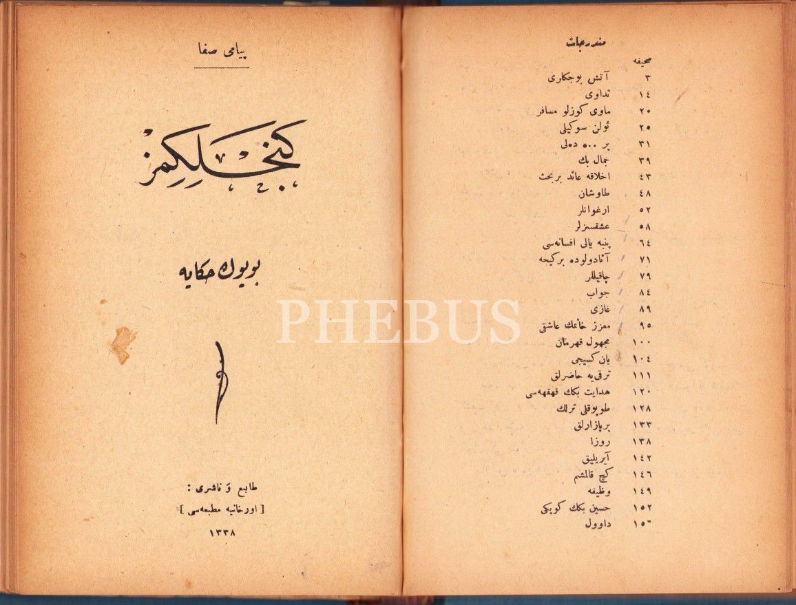 Peyami Safa'ya ait Osmanlıca 4 kitap tek ciltte, Ateş Böcekleri, 159 sayfa; Gençliğimiz, 79 sayfa; Yürü Yavrum Yürü!, 80 sayfa; Süngülerin Gölgesinde 63 sayfa, Orhaniye Matbaası, İstanbul 1341, 14x20 cm