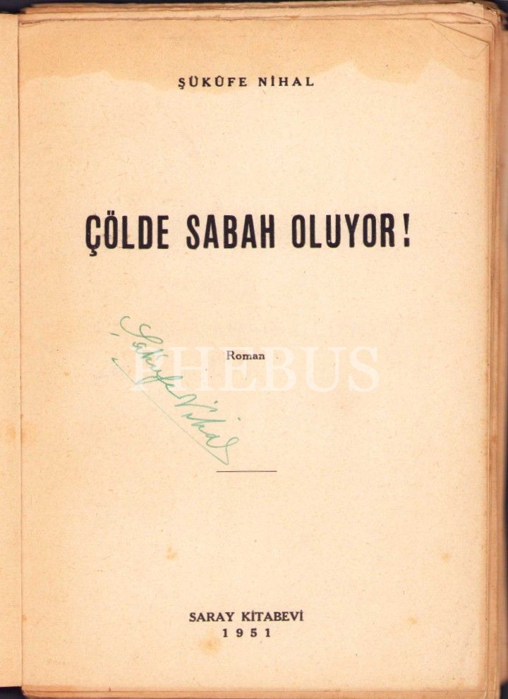 Şüküfe Nihal'den İmzalı ve İthaflı "Çölde Sabah Oluyor", İlk Baskı, 1951, ön, arka kapak ve sayfalar yorgun vaziyettedir