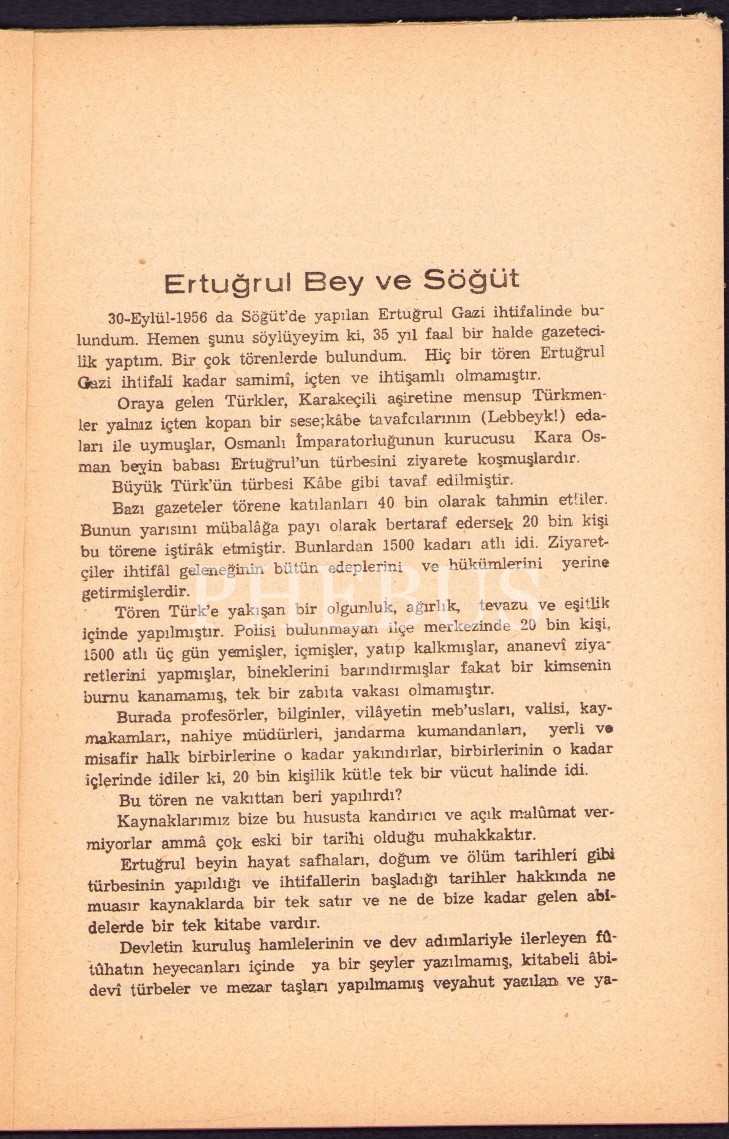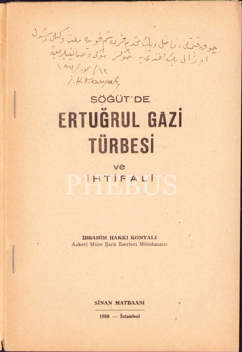 İbrahim Hakkı Konyalı'dan Osmanlıca İthaflı ve İmzalı "Söğüt'de Ertuğrul Gazi Türbesi ve İhtifali", 1959, 63 sayfa, 17x24 cm, metin ciltten ayrık, kapak yorgun haliyle
