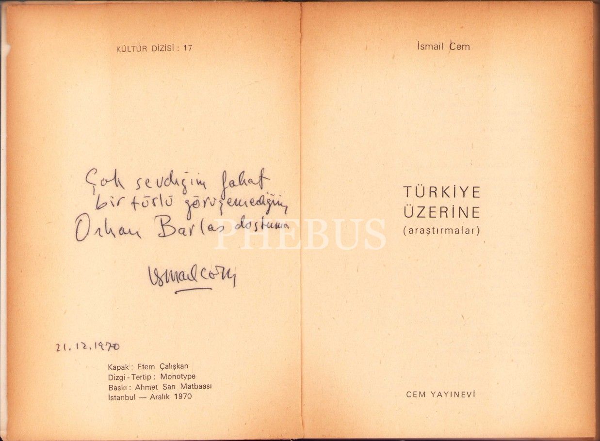 İsmail Cem'den İmzalı ve İthaflı "Türkiye Üzerine" -araştırmalar-, İlk Baskı, 1970