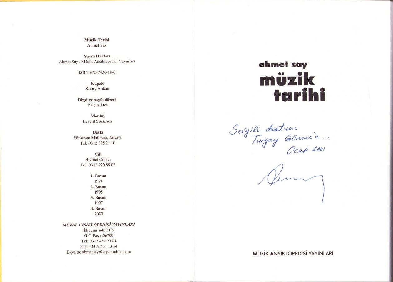 İthaf "Sevgili Dostum Turgay Gönenç'e Ocak 2001" şeklindedir. 1935 doğumlu Ahmet Say, müzik eğitimcisi ve müzik yazarı. Fazıl Sayın yazarıdır.