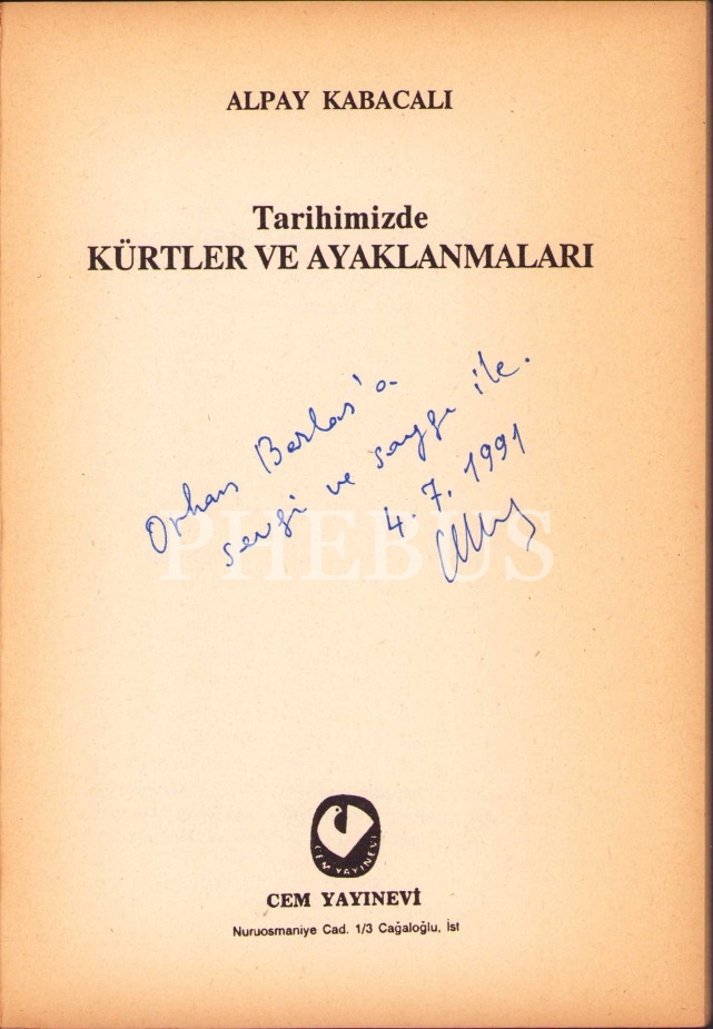Alpay Kabacalı'dan İmzalı ve İthaflı "Tarihimizde Kürtler ve Ayaklanmaları", 1991, yorgun haliyle
