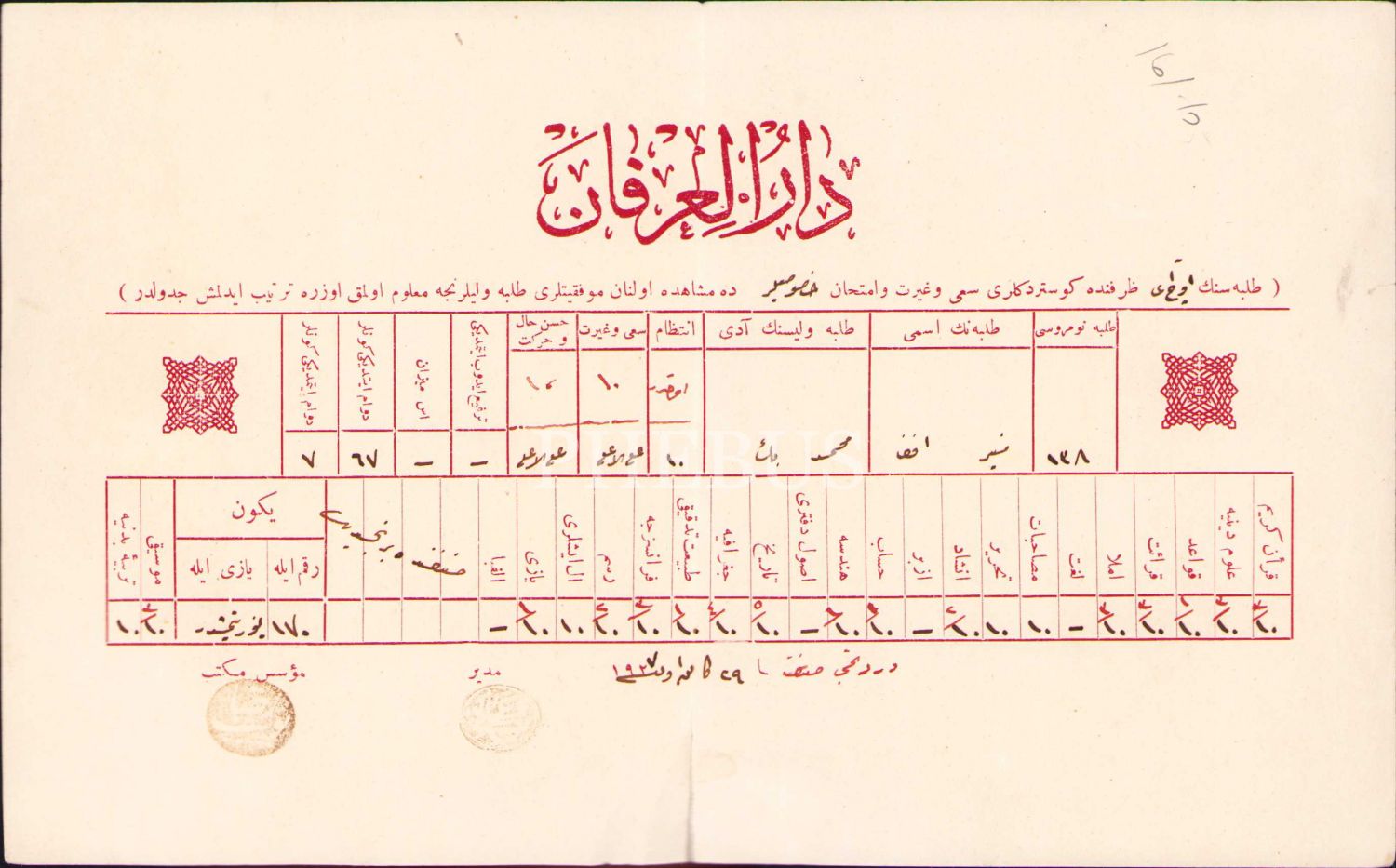 Osmanlıca Dârü'l-İrfân antetli, öğrenci durumu hakkında veli bilgilendirme cetveli, 1927 tarihli, 14x23 cm, alt kenardan yırtık haliyle