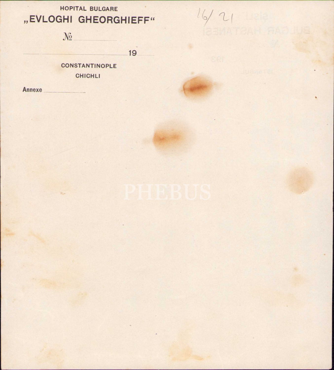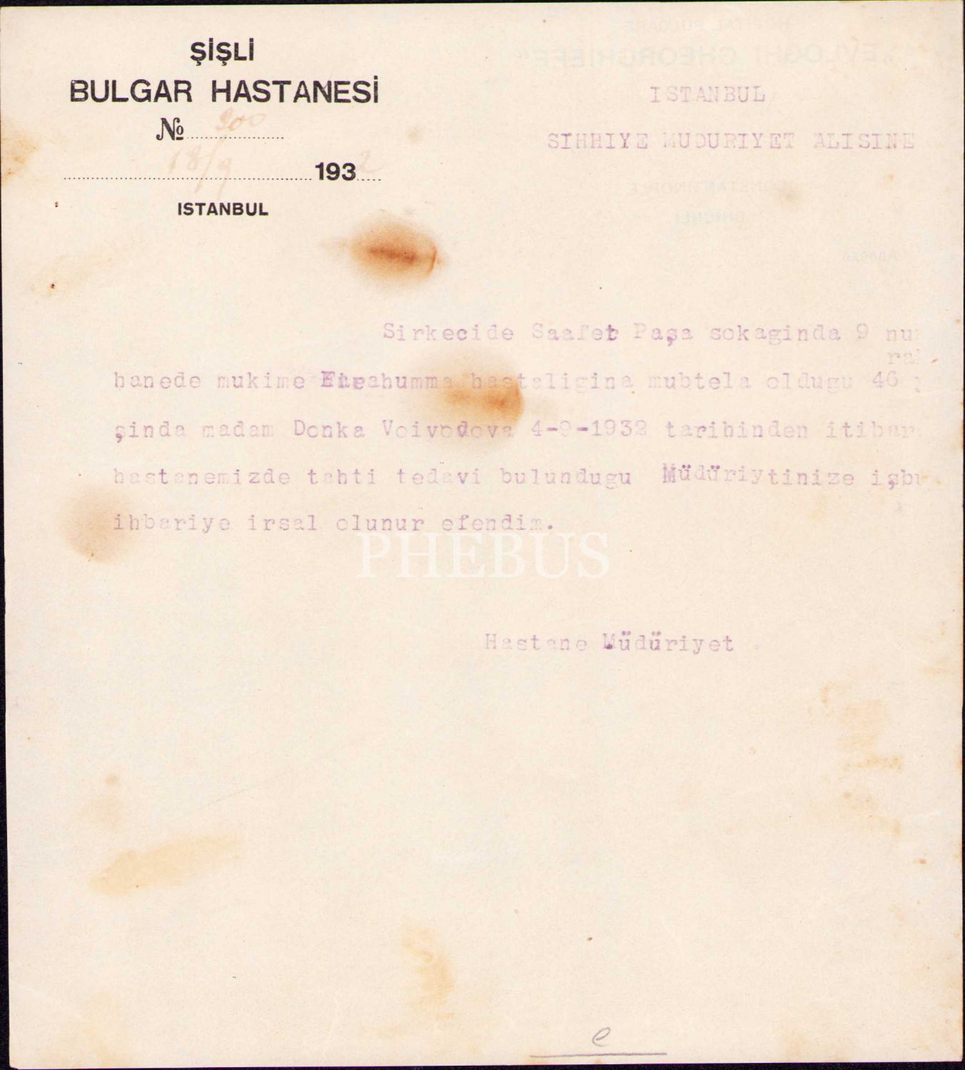 Şişli Bulgar Hastanesi'nden İstanbul Sıhhiye Müdürlüğü'ne bilgilendirme mektubu, 1932, 17x19