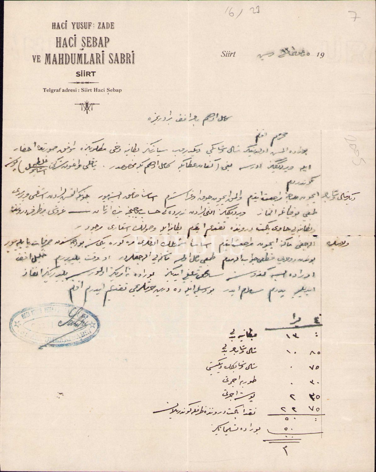 Haci Şebap ve Mahdumları Sabri-Siirt antetli, sipariş içerikli Osmanlıca mektup, 1931, 21x27 cm