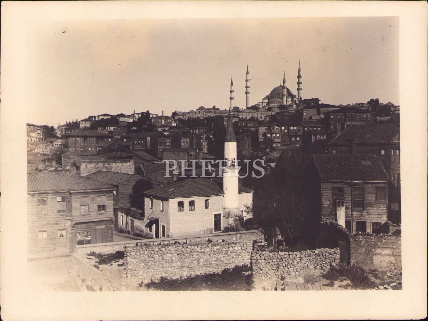 Osmanlıca Foto Ahmed Emin damgalı Süleymaniye genel görünümü, 18x23 cm, kenarları yıpranmış haliyle