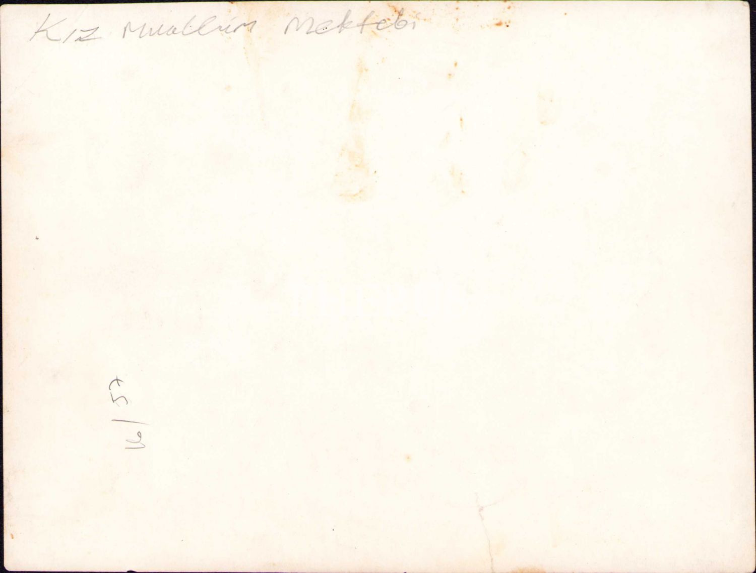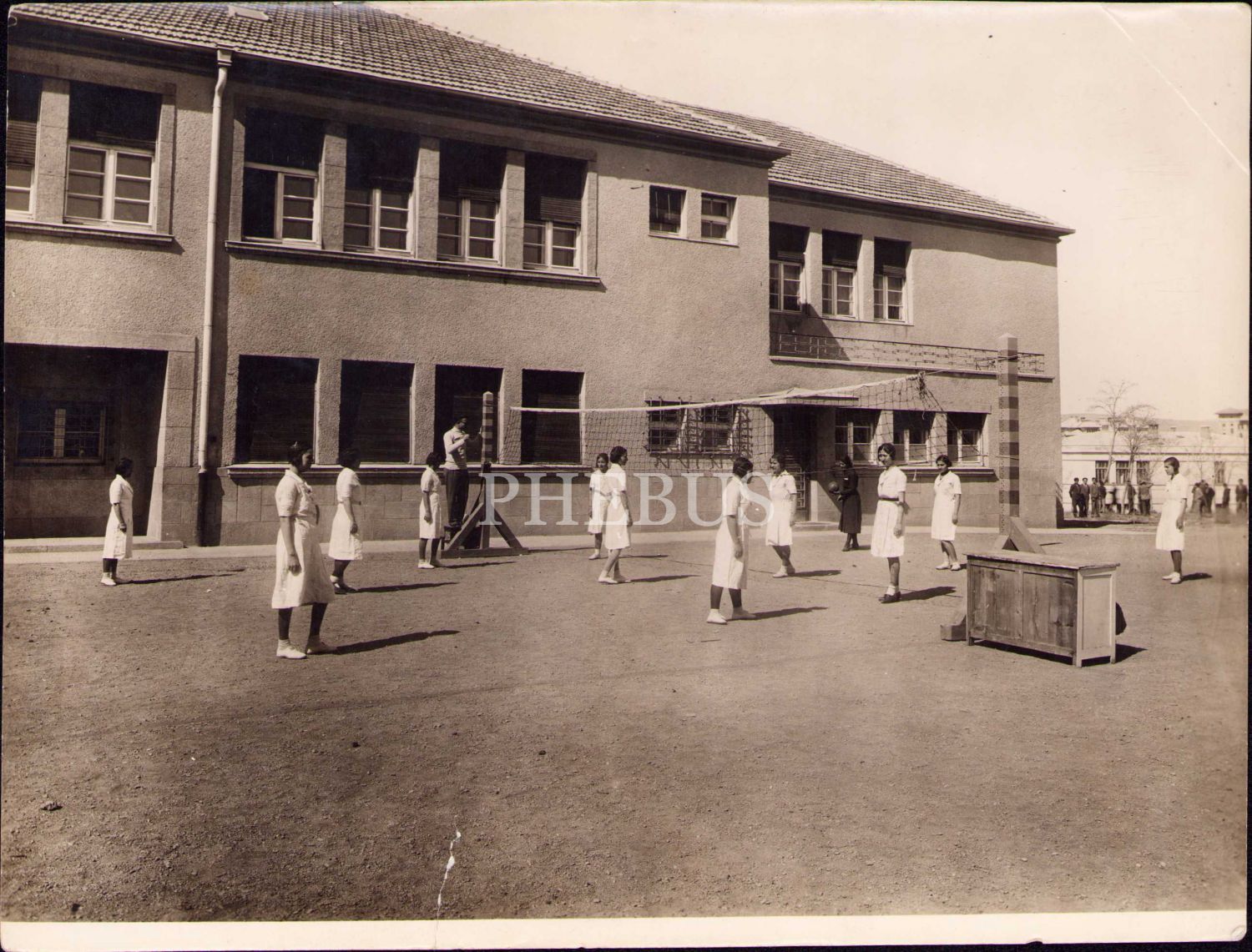 Okul bahçesinde kız voleybol takımı, 17x22 cm, köşeden kırık ve alt kenardan yırtık haliyle