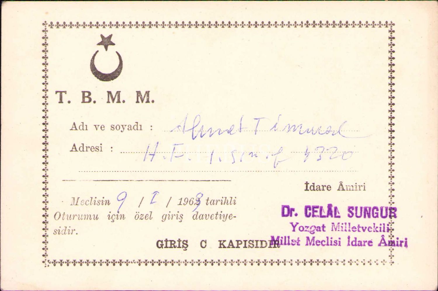 T.B.M.M. antetli meclis oturum davetiyesi, 1963, 9x14 cm
