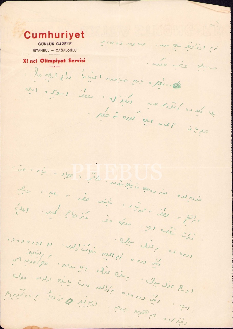 Cumhuriyet Günlük Gazete antetli kâğıtta Osmanlıca şahsi mektup, 2. sayfadan başlıyor, 19x27 cm, kırışmış haliyle