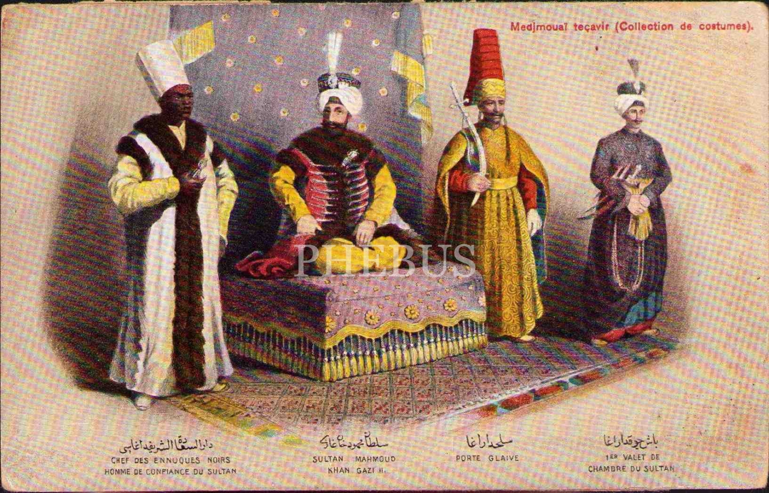 Kostüm kartpostalı: Baş Çuhadar Ağa-Silahdar Ağa-Sultan Mehmed Han Gazi-Darüssaade Ağası, kenarları yıpranmış haliyle