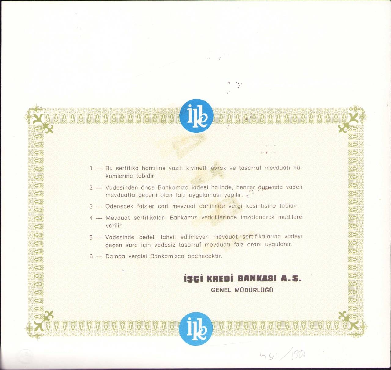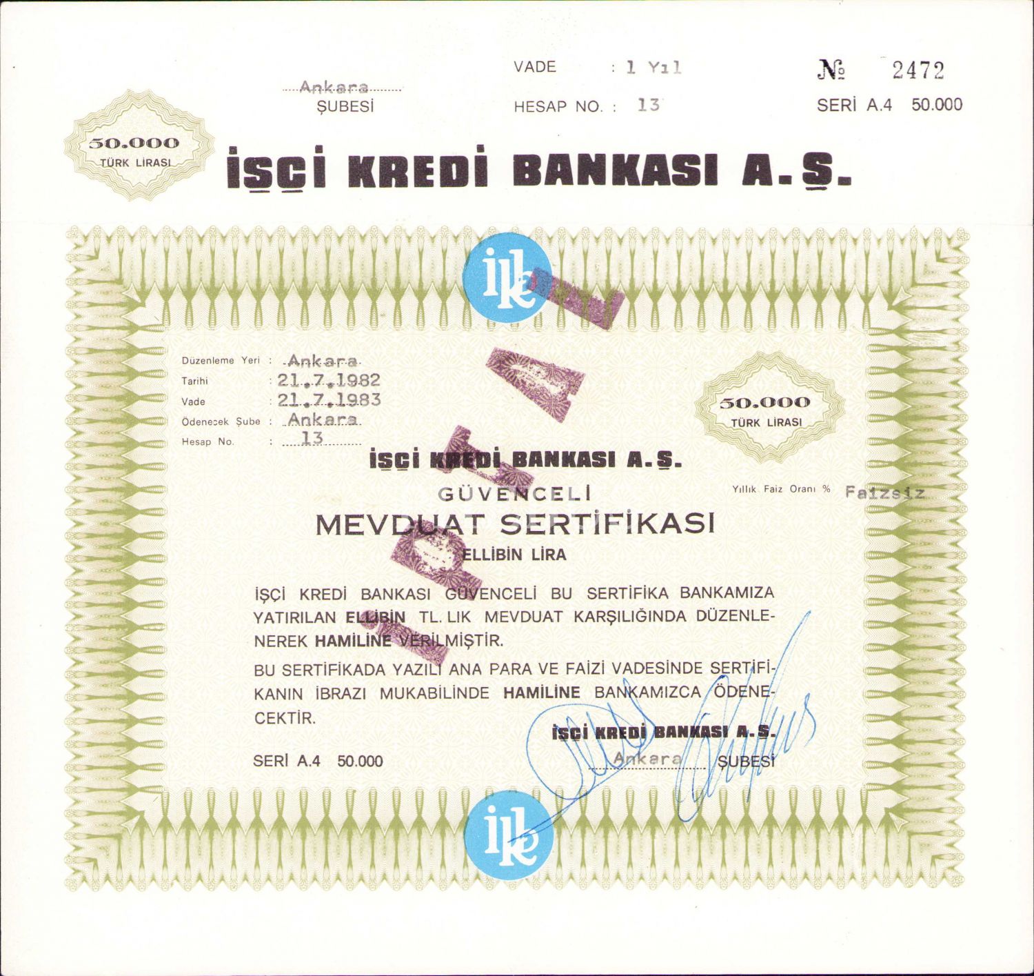 İşçi Kredi Bankası güvenceli mevduat sertifikası, Ankara 1983, 22x23 cm