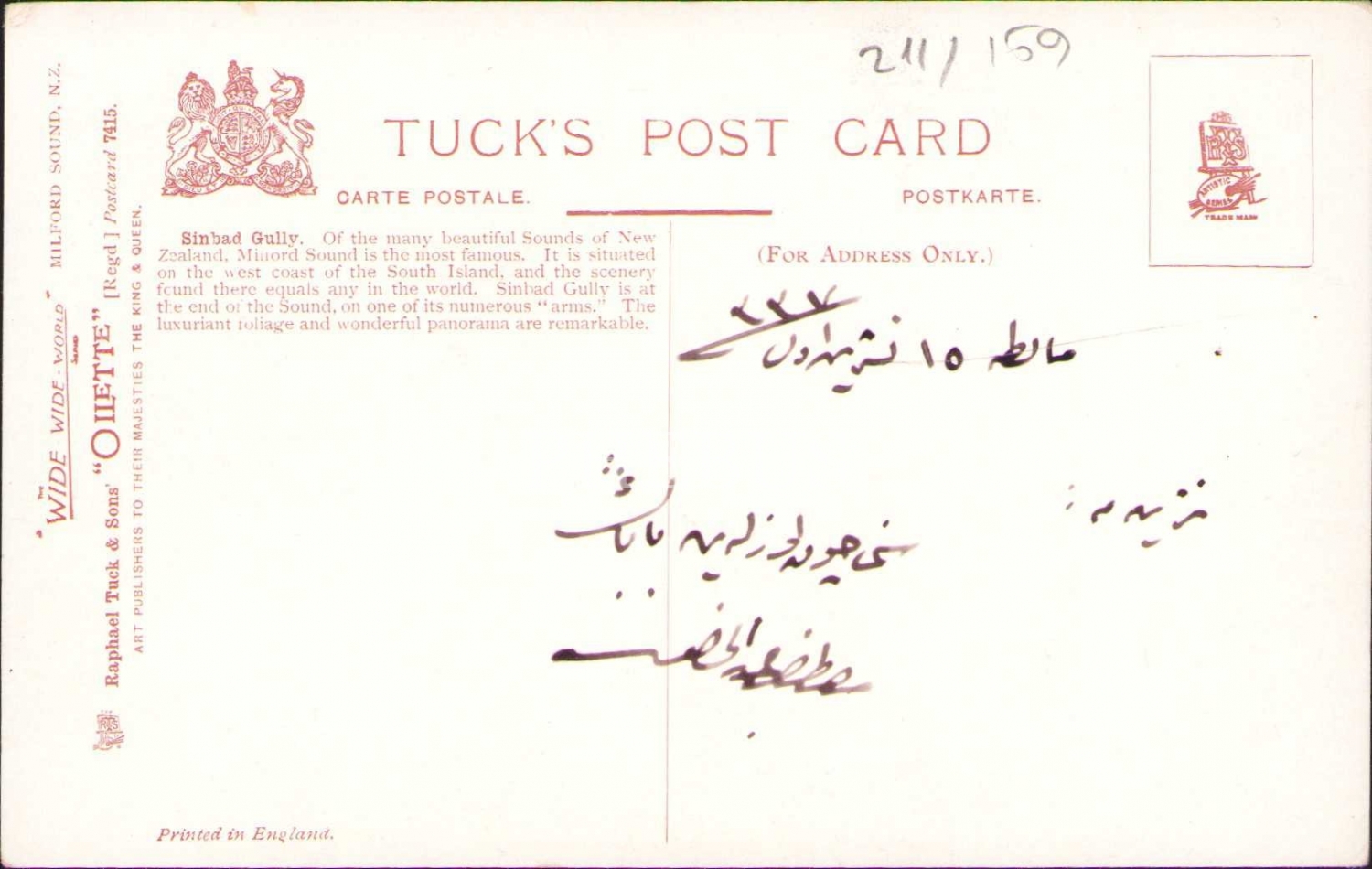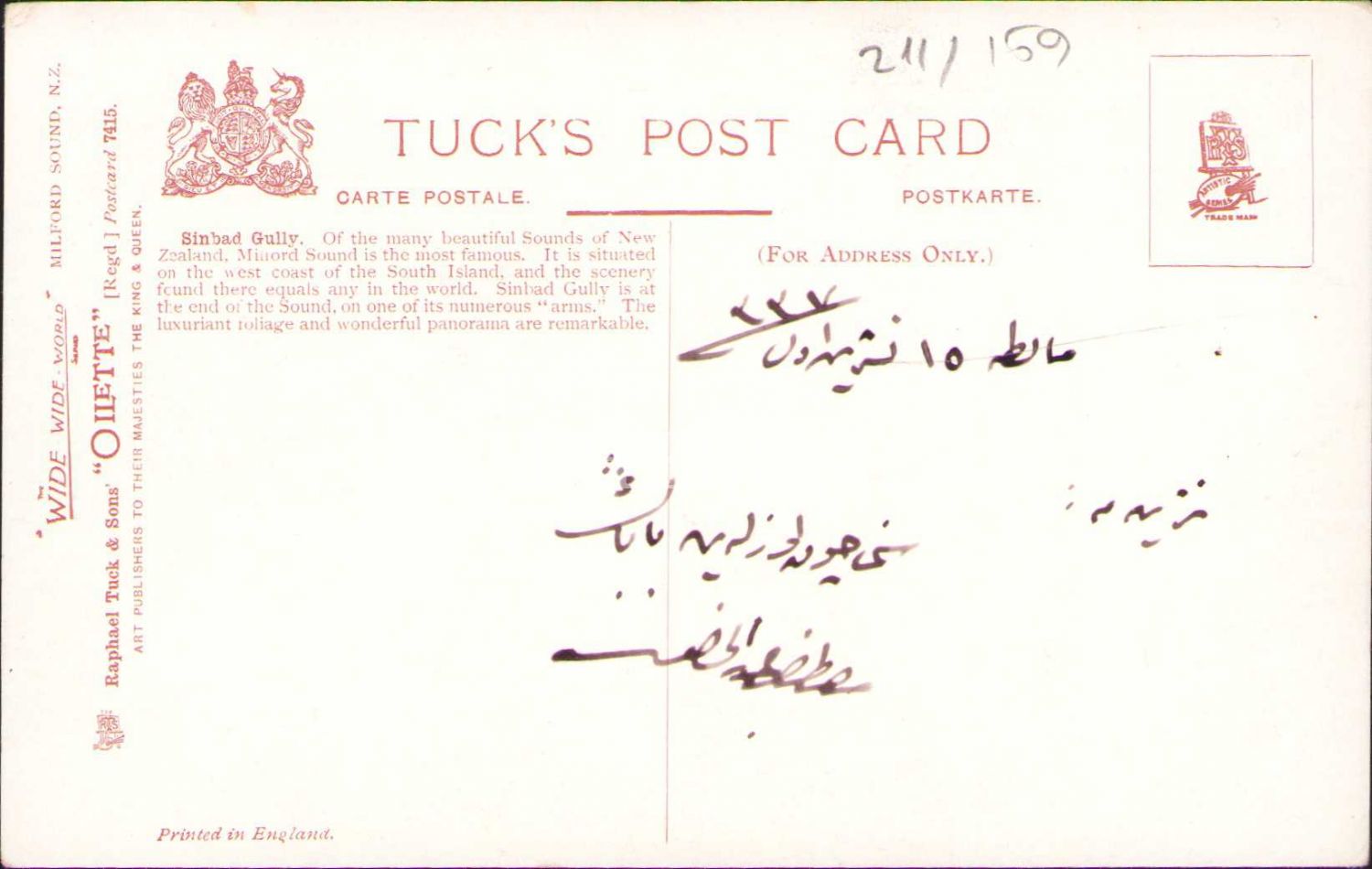 Sinbad Gully-Yeni Zelanda, İngiltere baskı, arkası Osmanlıca yazılı