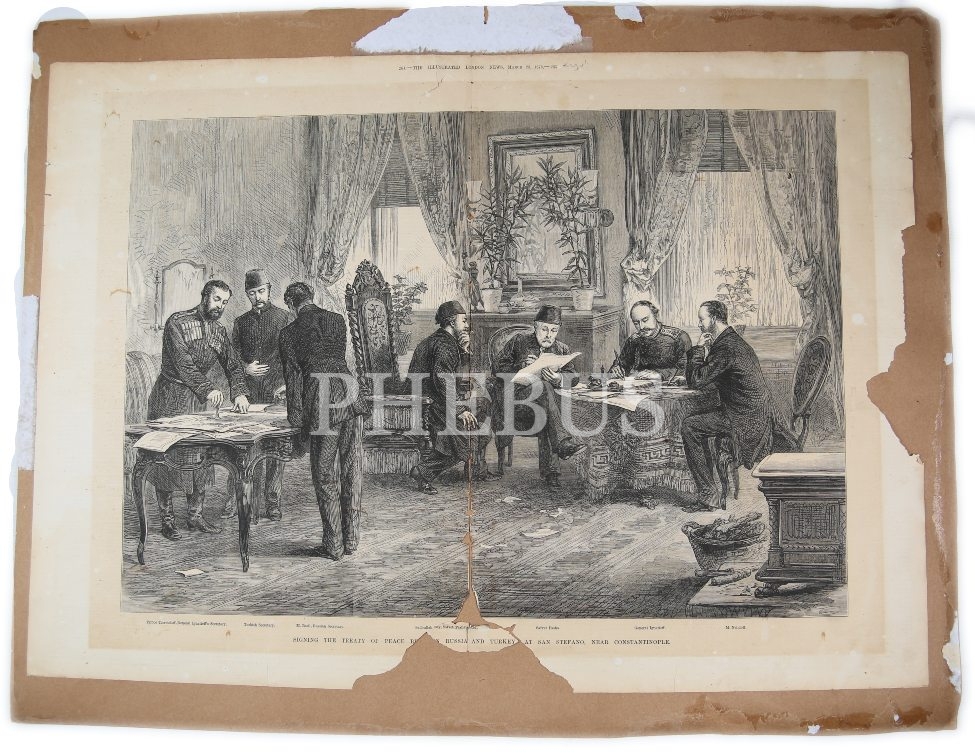 Ayastefanos Anlaşması meclisini resmeden gravür, The İllustrated London News, 23 Mart 1878, kartona yapışık, 39x55 cm, epey yıpranmış haliyle