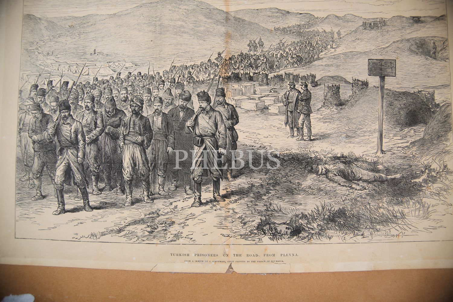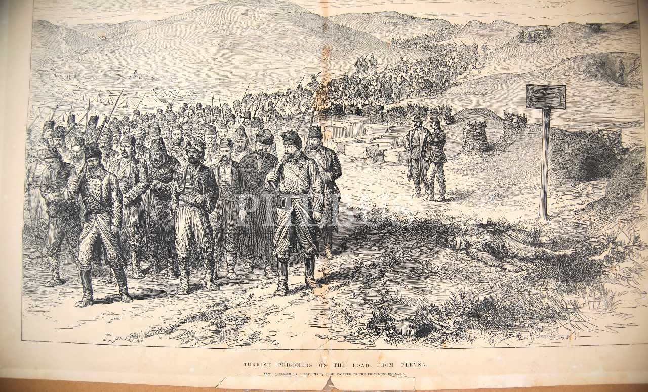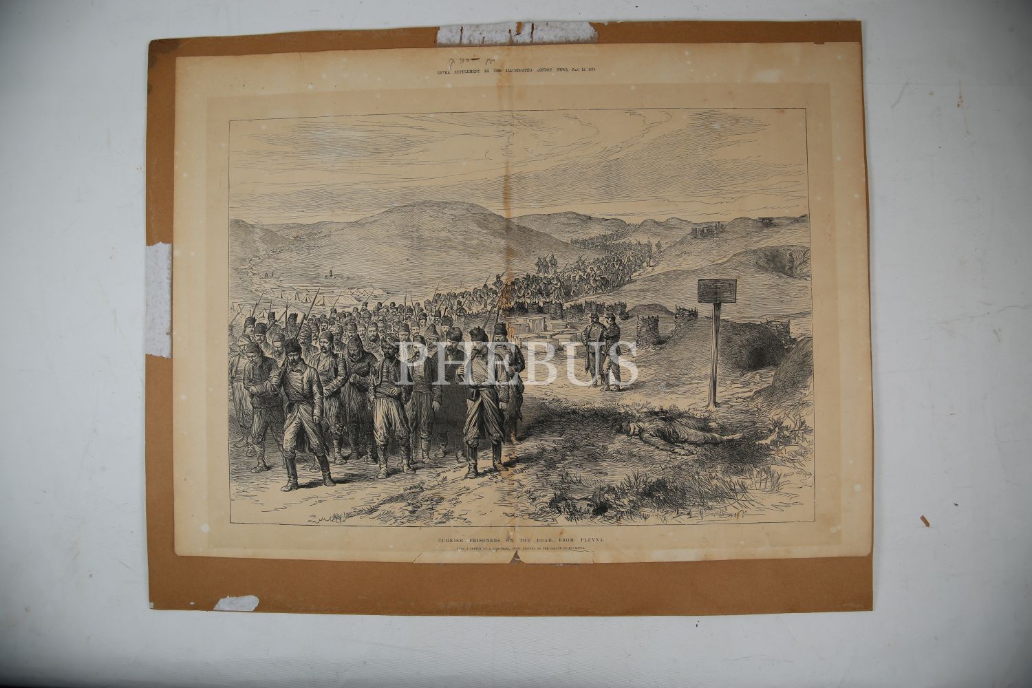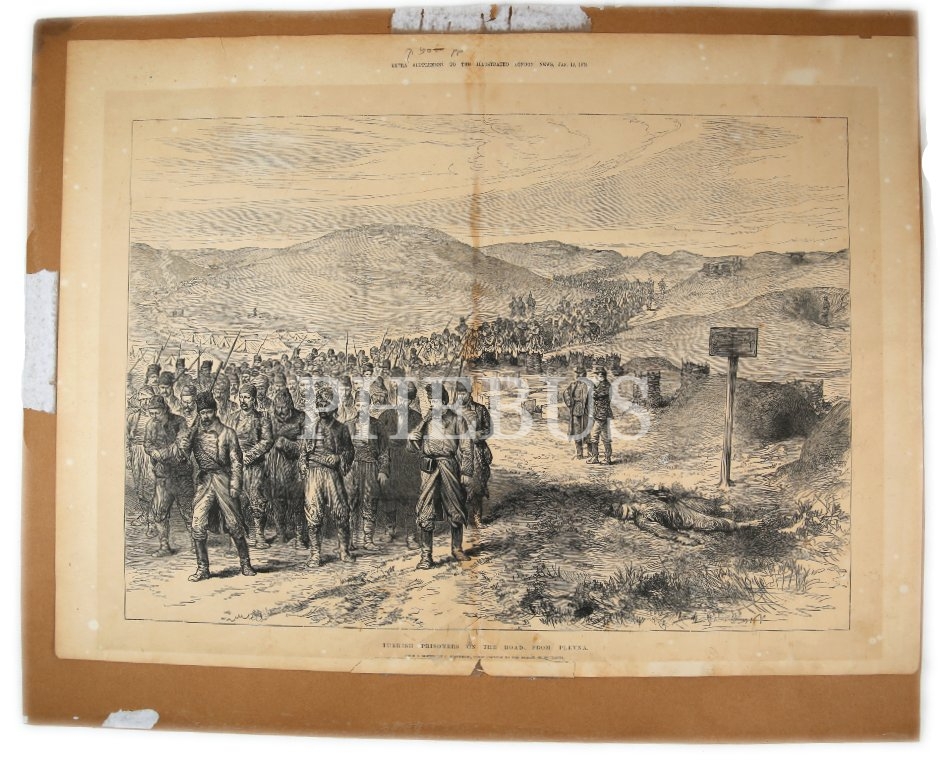 Plevne'den dönen Türk esirler gravürü, The İllustrated London News, 12 Ocak 1878, kartona yapışık, 39x53 cm, alt kenarı tamirli haliyle