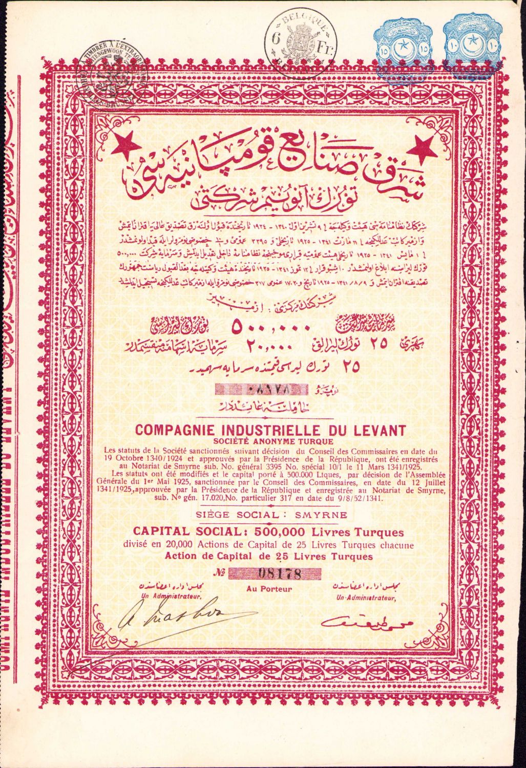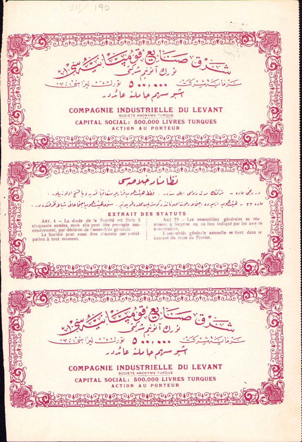 Osmanlıca Şark Sanayi Kumpanyası Türk Anonim Şirketi hisse senedi, 20x29 cm