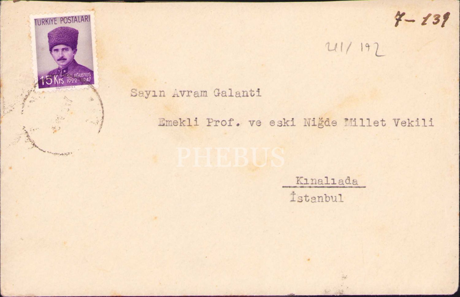 Dr. Lütfi Kırdar'dan Eski Niğde Milletvekili Avram Galanti'ye gönderilmiş zarf, 11x16 cm
