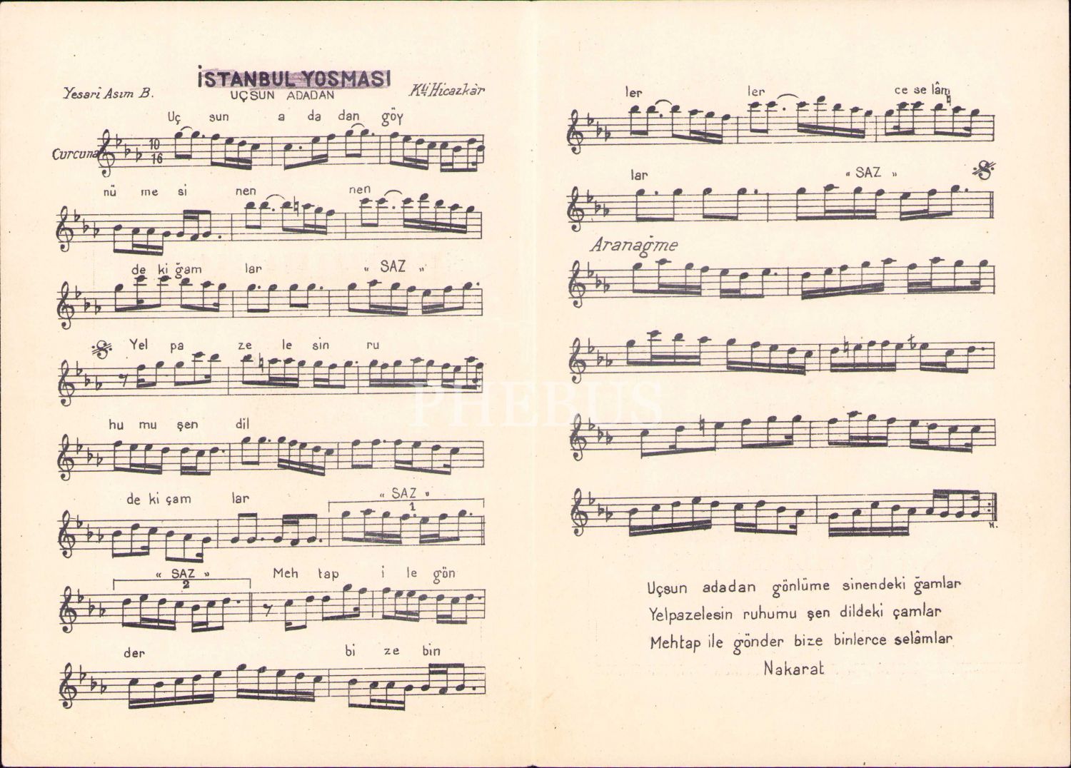 Kudmanizade Şamlı İskender'den Yesari Asım Bey'e ait İstanbul Yosması notası, 20x28 cm