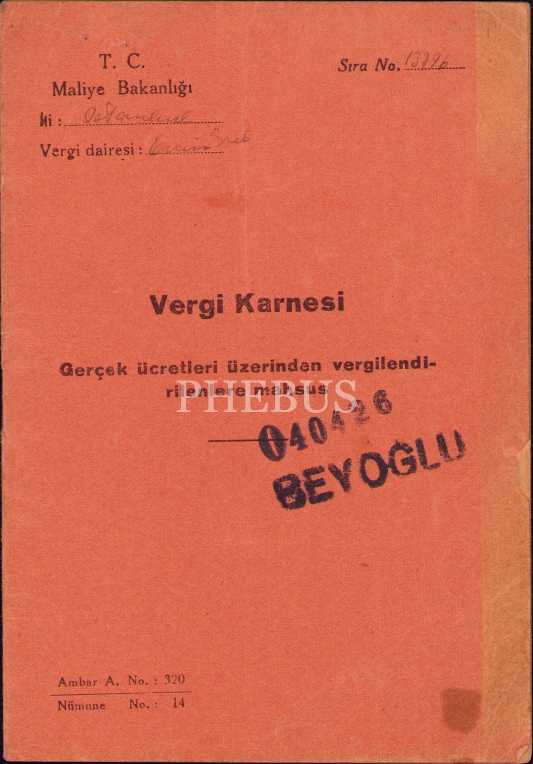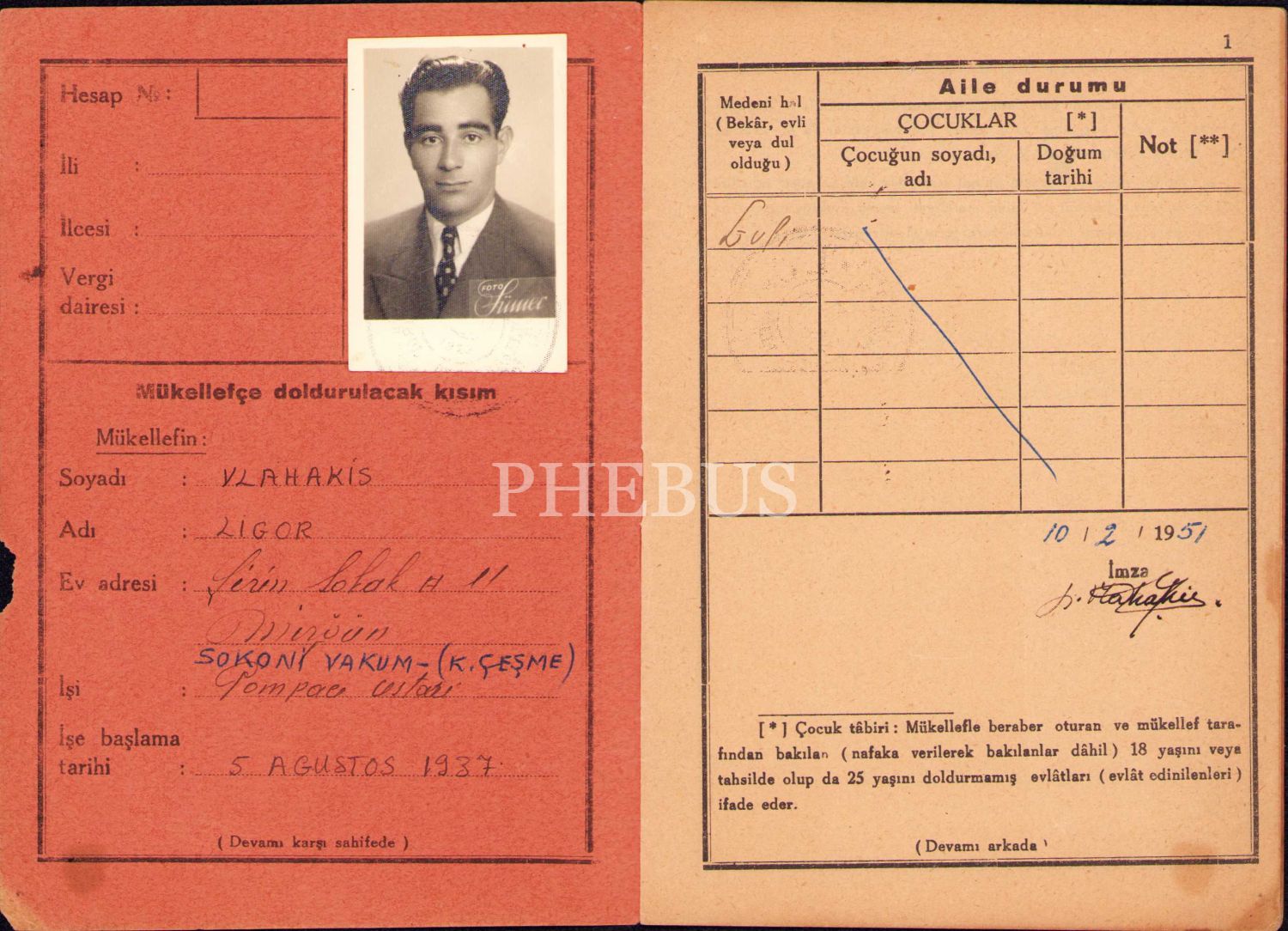 T.C. Maliye Bakanlığı fotoğraflı vergi karnesi, Ligor Vlahakis'e ait, 1937 tarihli, 14 s., 11x17 cm