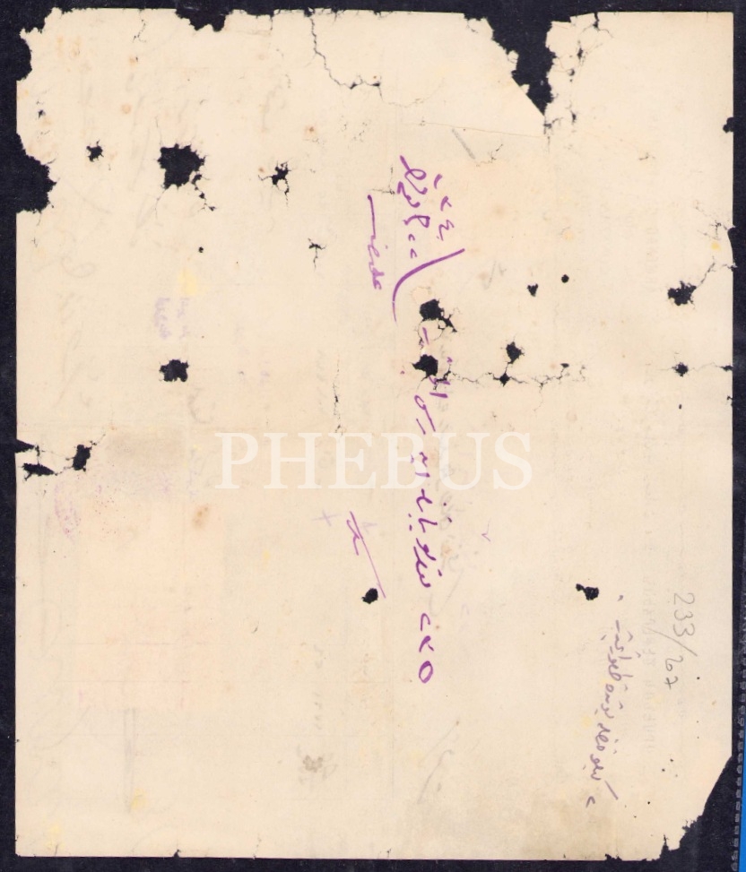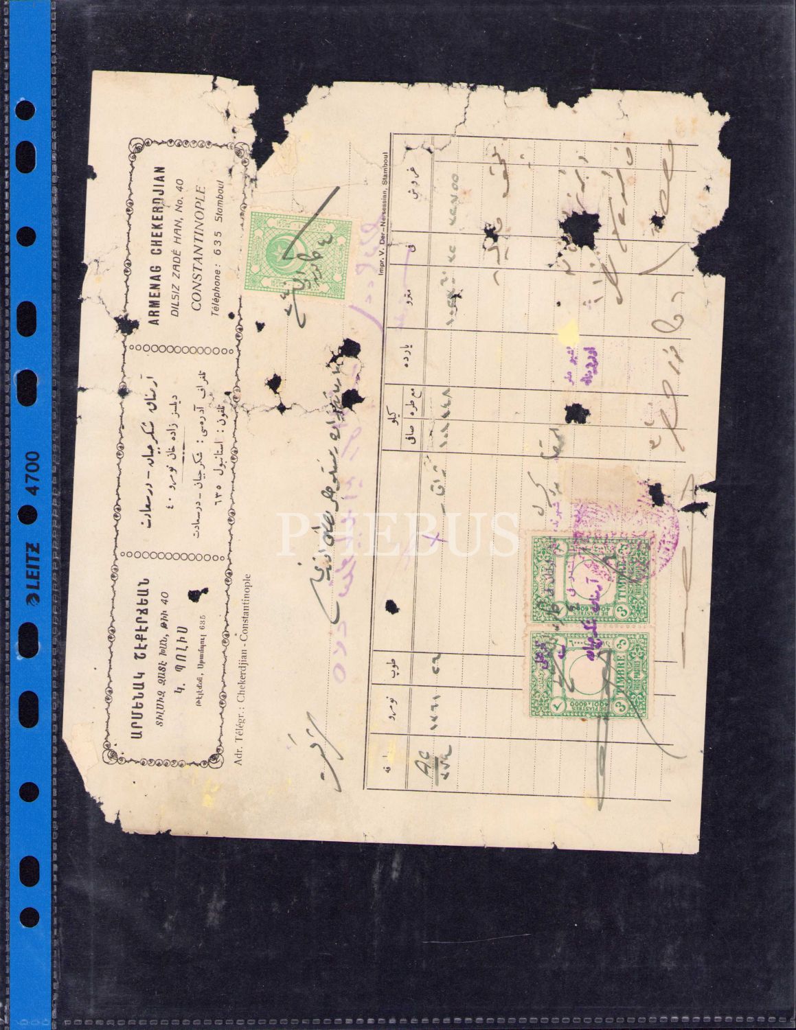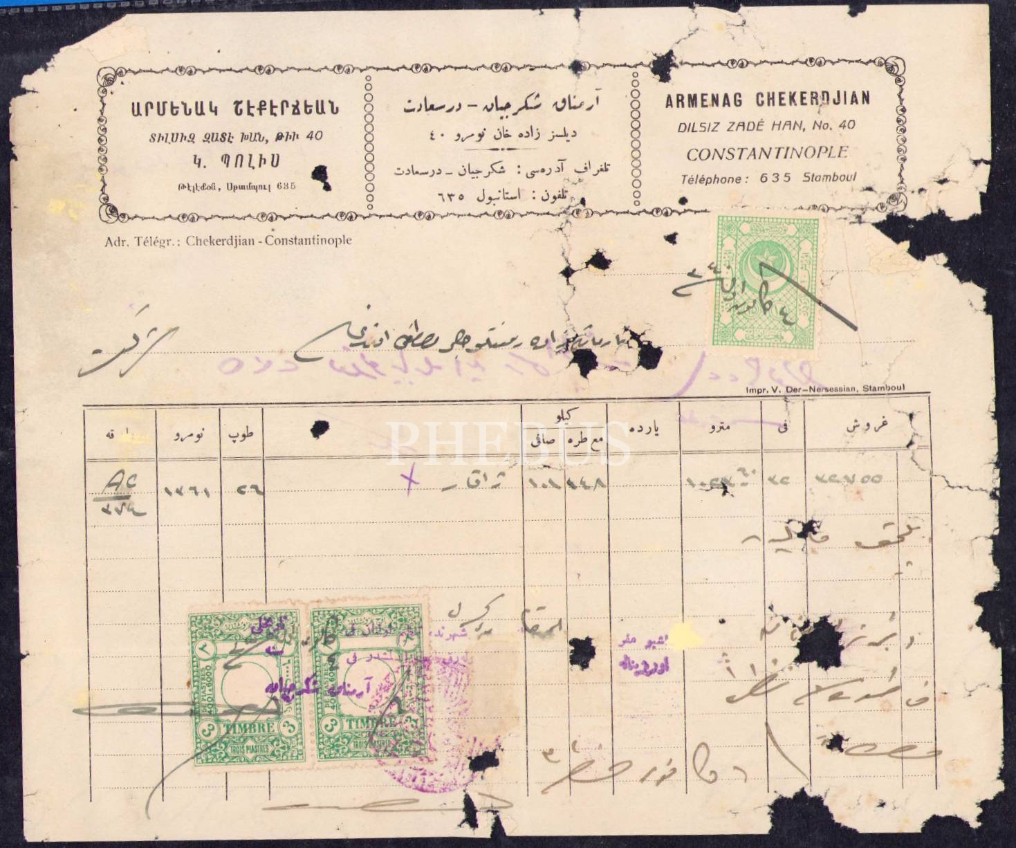 Ermenice-Osmanlıca-Fransızca Armenak Şekerciyan antetli fatura, 1340 tarihli, 19x22 cm, epey yıpranmış haliyle
