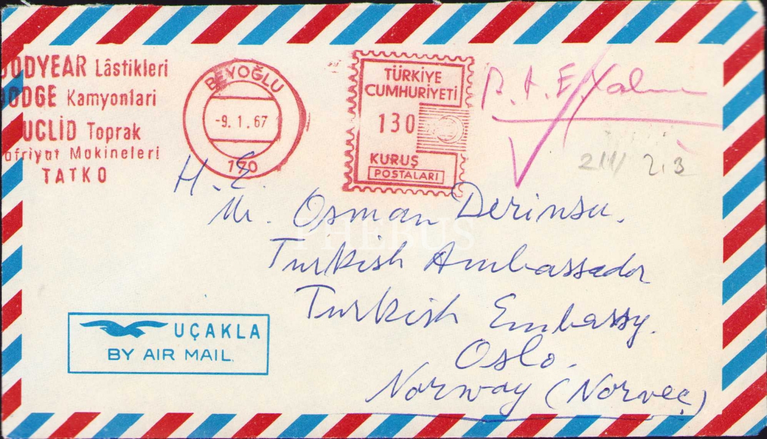 Norveç Büyükelçisi Osman Derinsu'ya Türkiye'den gönderilen zarf, 10x17 cm, üstten açık haliyle