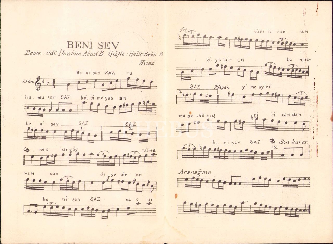 Nota Yayıncısı Şamlı İskender'den Udî İbrahim Abud'a ait hicaz şarkı notası, "Sev Beni Ruhumu Sar", Andre Jorjoviç Matbaası, 14x21 cm