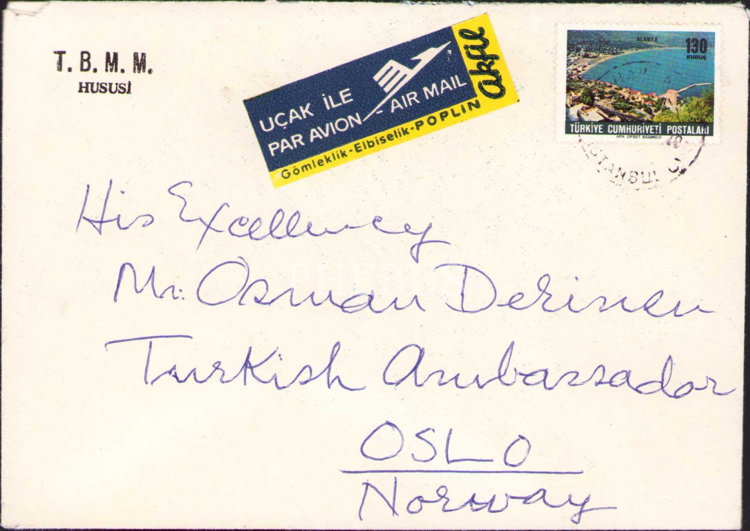 Norveç Büyükelçisi Osman derinsu'ya gönderilen T.B.M.M. Hususi antetli zarf, 11x16 cm, üstten açık haliyle