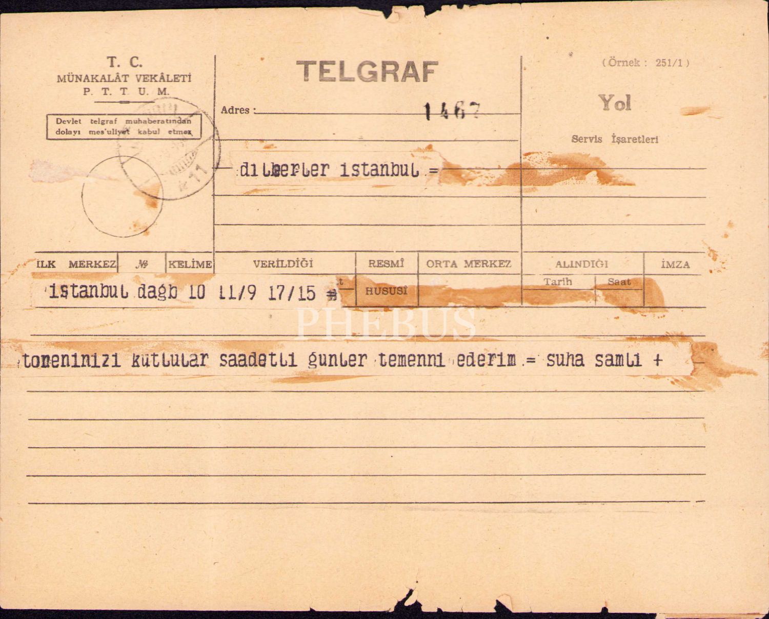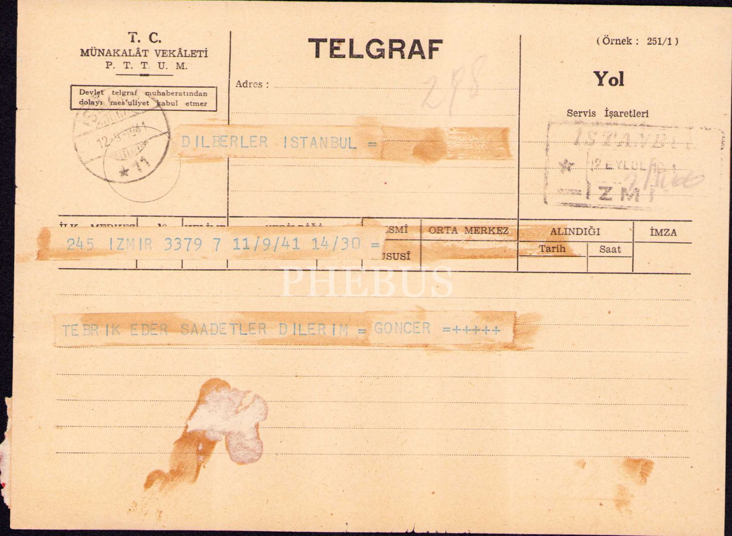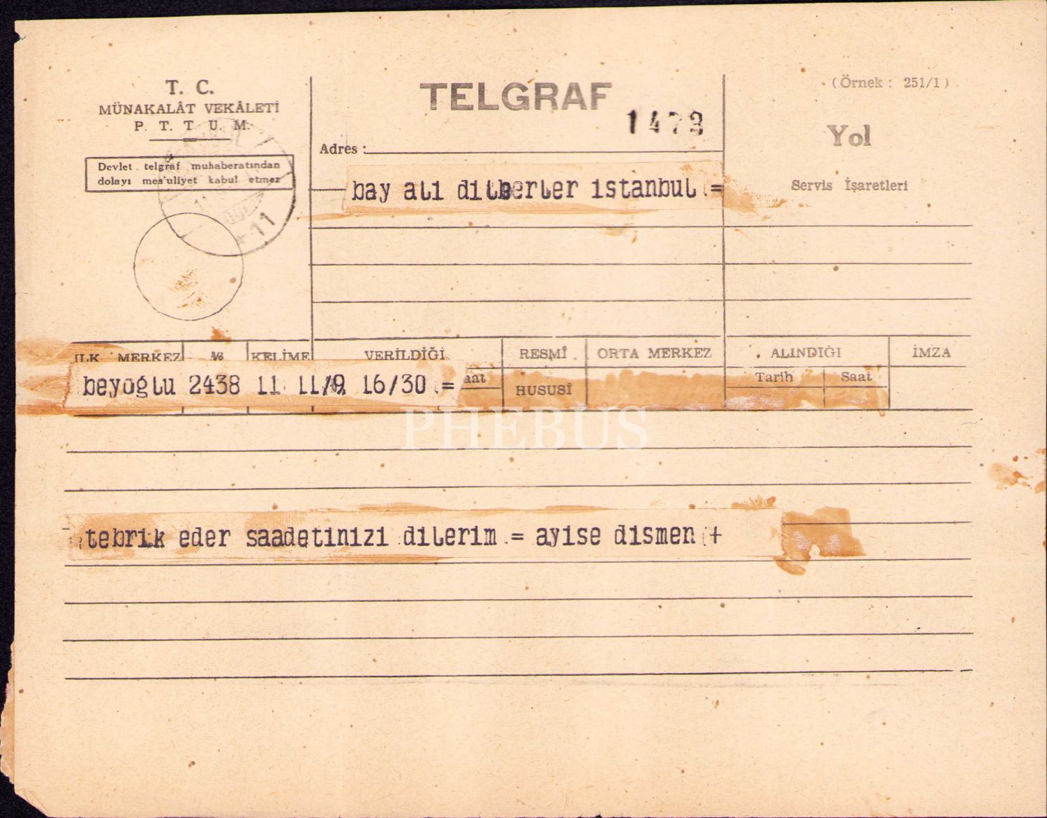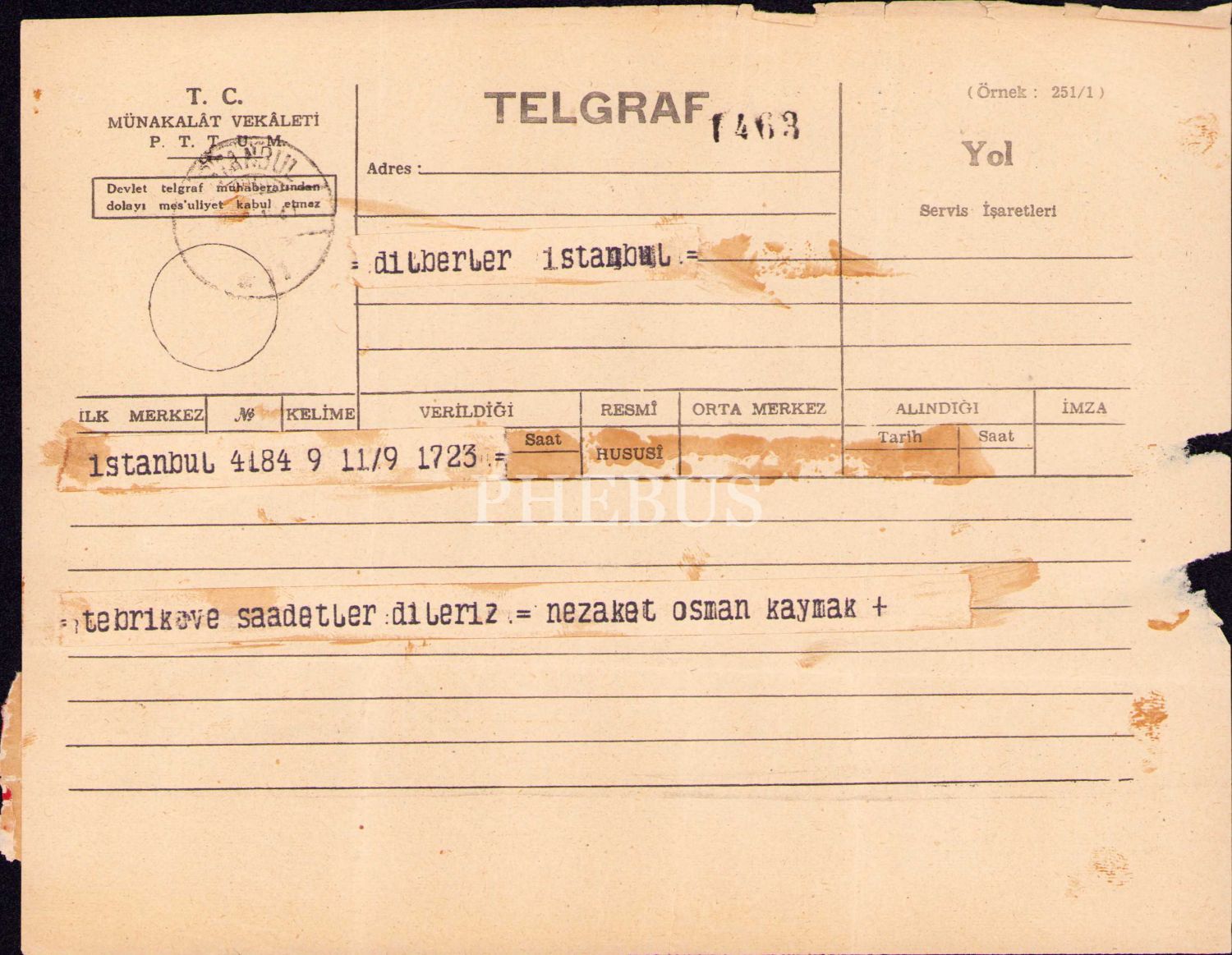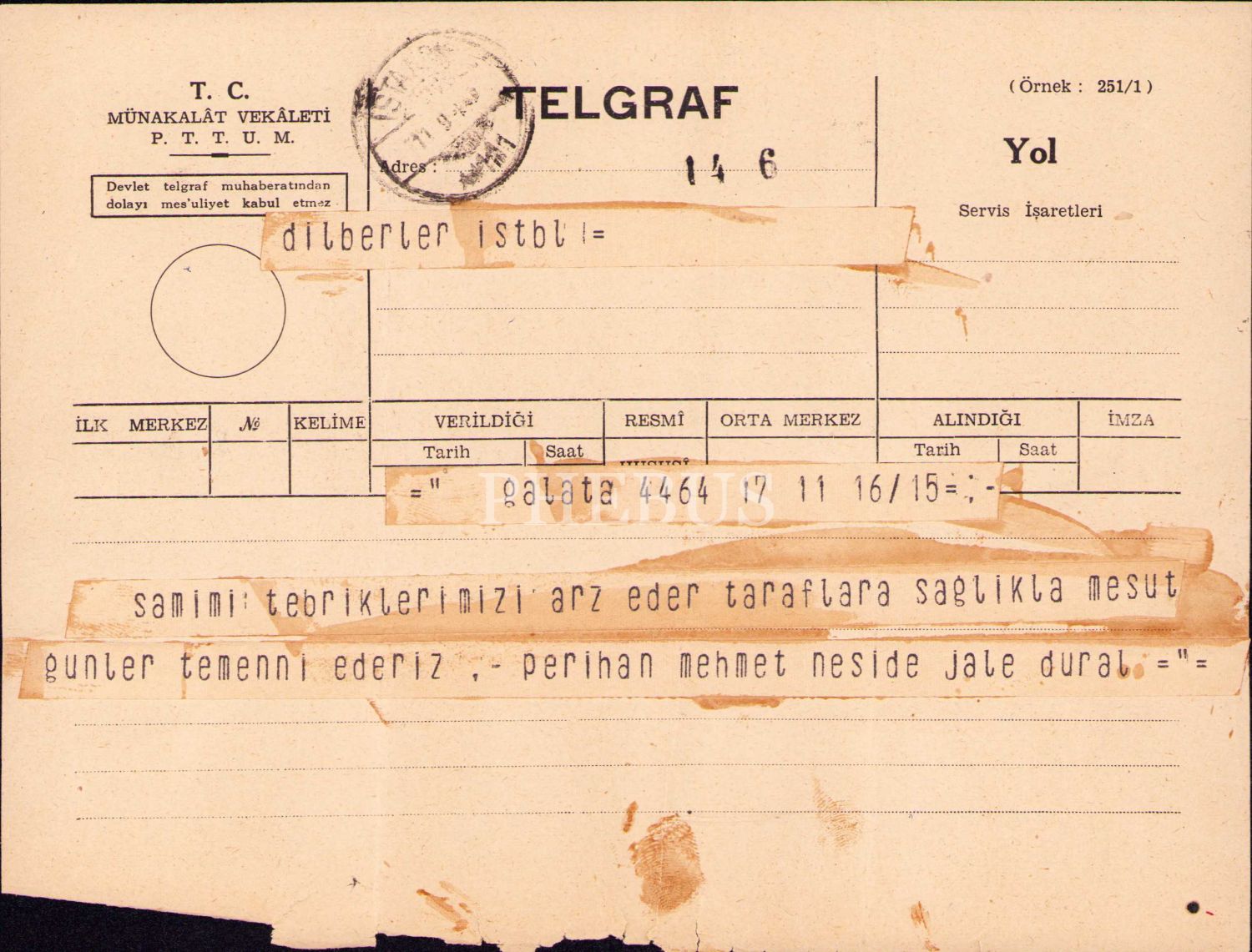 T.C. Münakalât Vekâleti antetli 5 adet tebrik telgrafı, 17x22 cm, kenarları yıpranmış haliyle