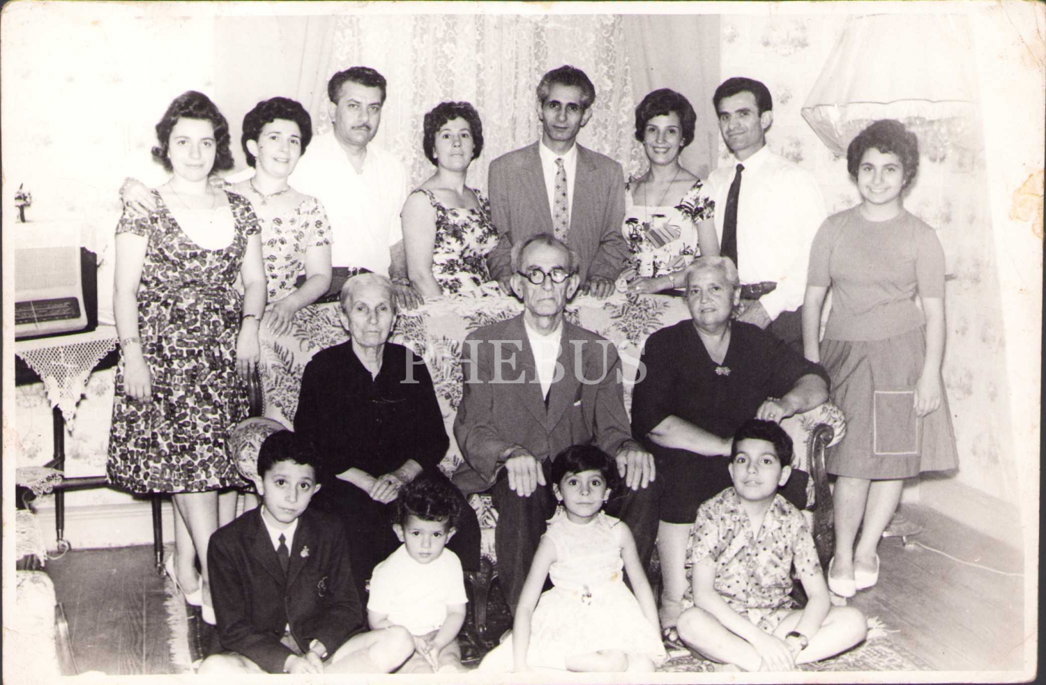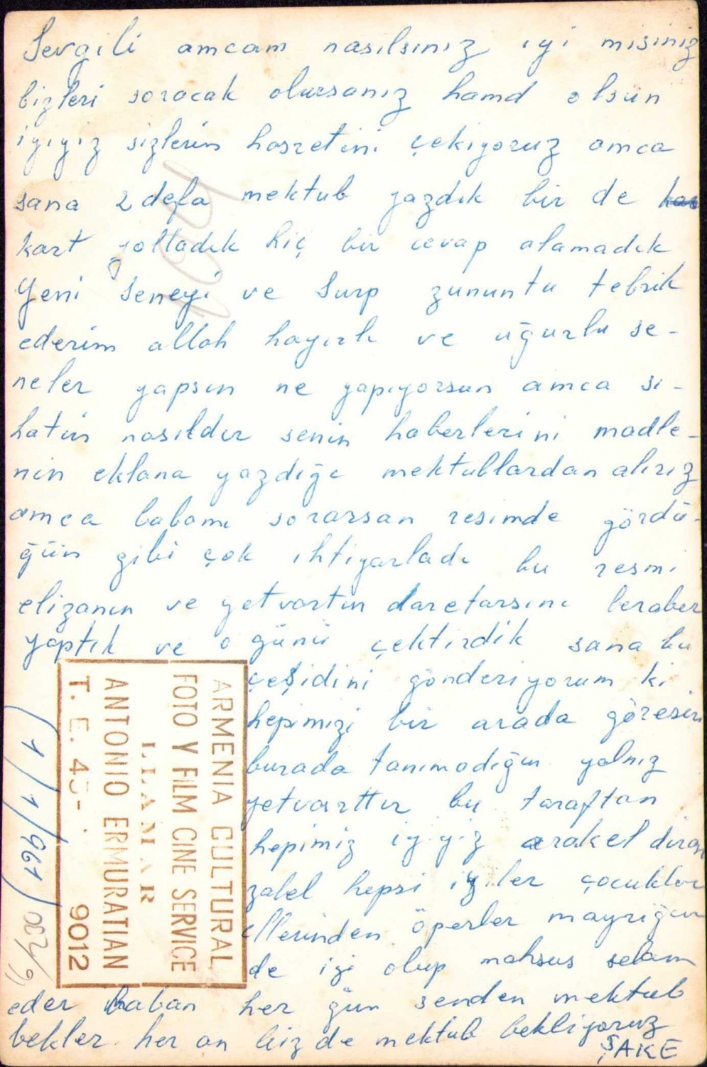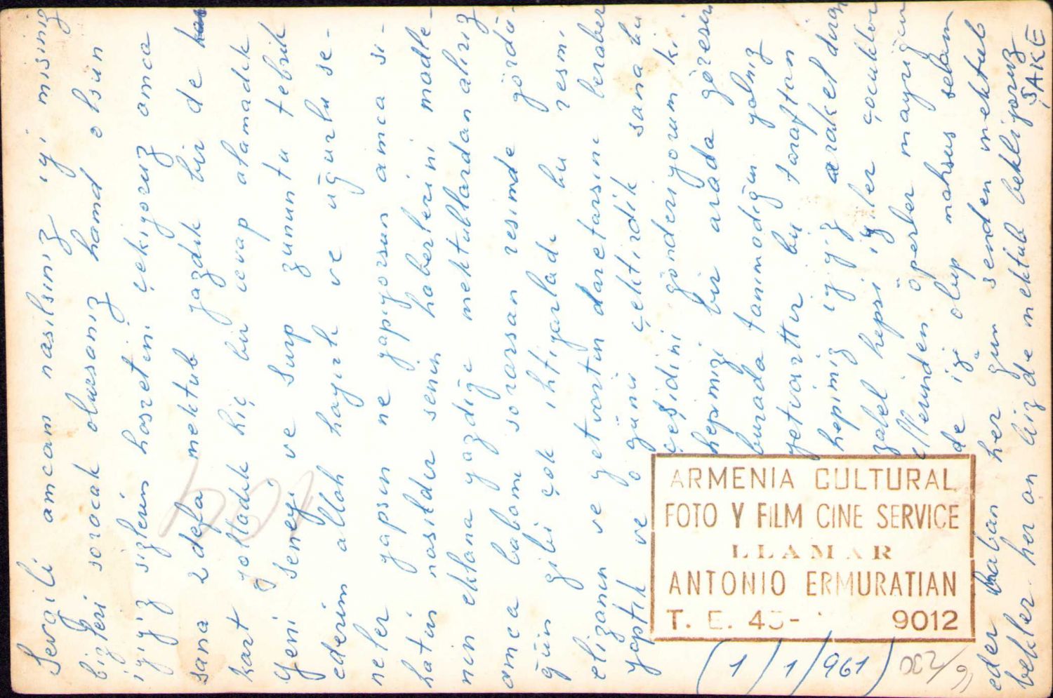 Arkasında mektup yazılı aile fotoğrafı, Armenia Cultural Foto Y Film Cine Service damgalı, 12x17 cm, köşeleri kırık haliyle