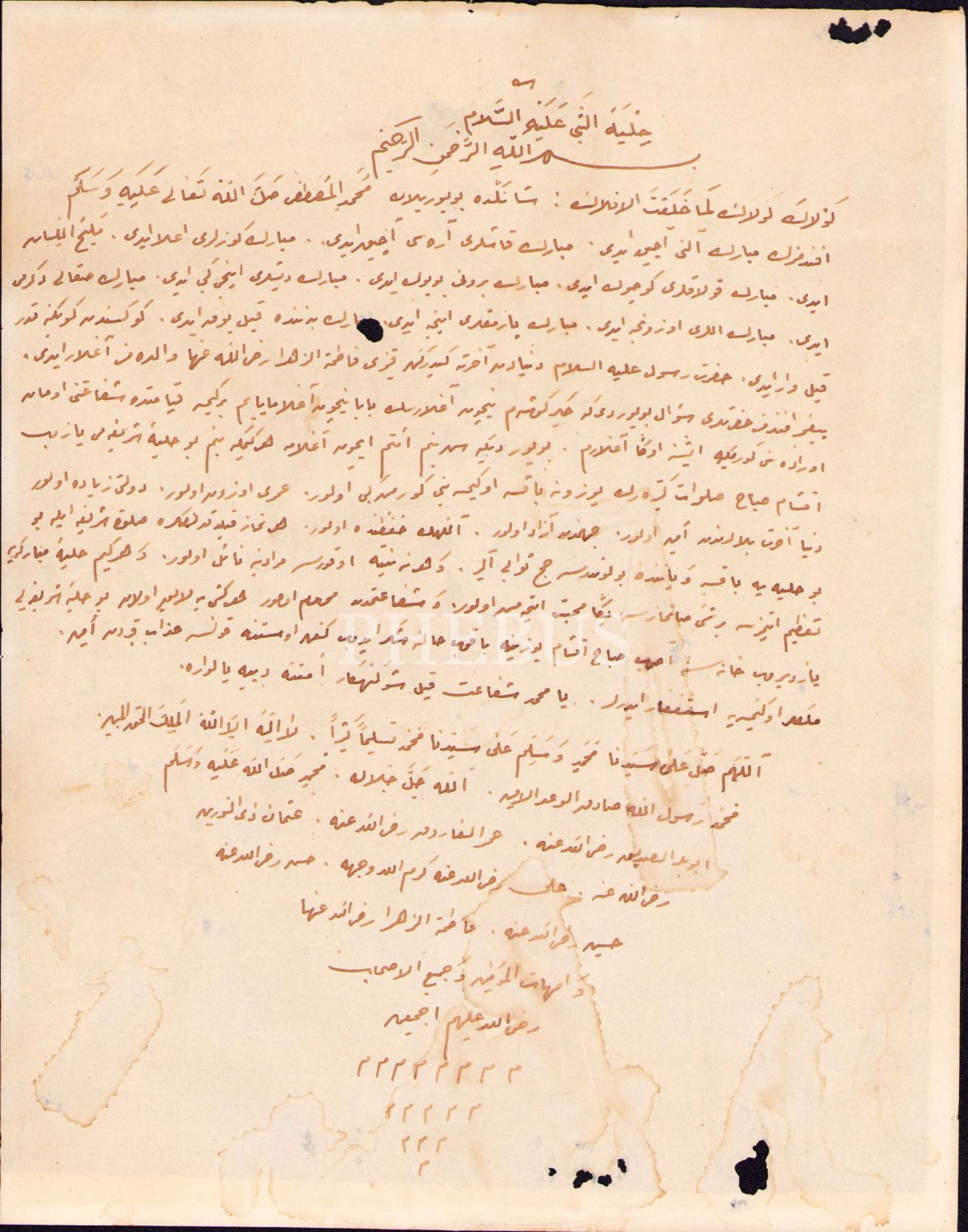 Osmanlıca-Arapça Hilye-i Şerif metni, 22x28 cm, yorgun ve su görmüş haliyle