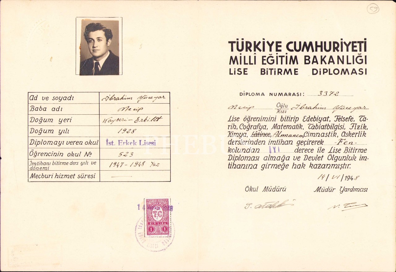 Fotoğraflı lise diploması, İstanbul Erkek Lisesi, 1948 tarihli, 22x33 cm