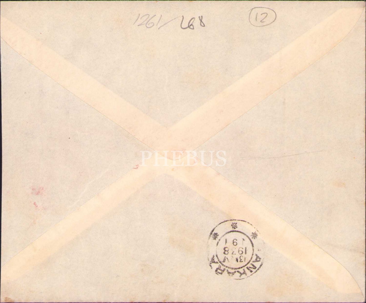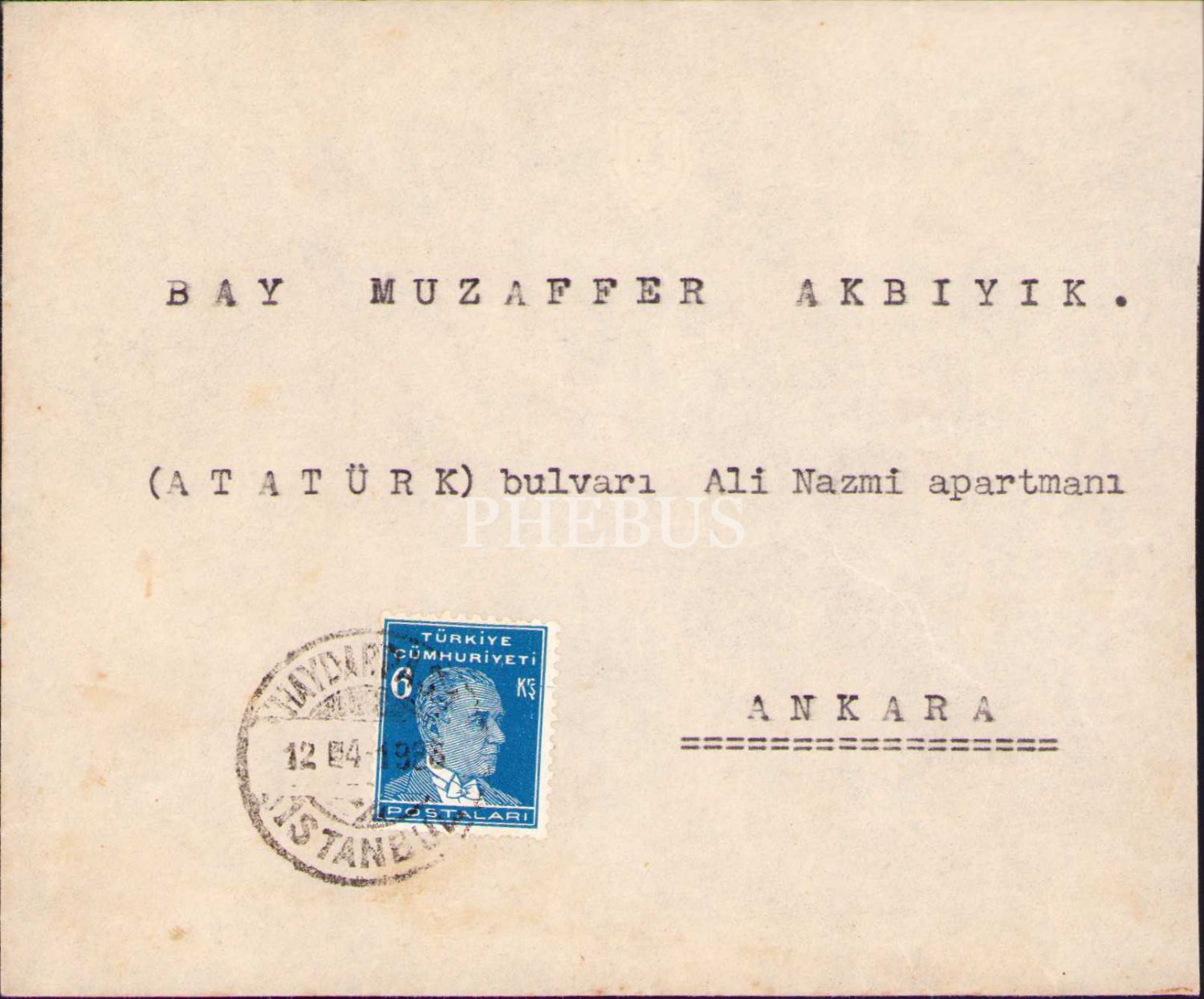 Muzaffer Akbıyık'a yönelik pullu ve damgalı zarf, yandan açılmış haliyle, 11x13 cm