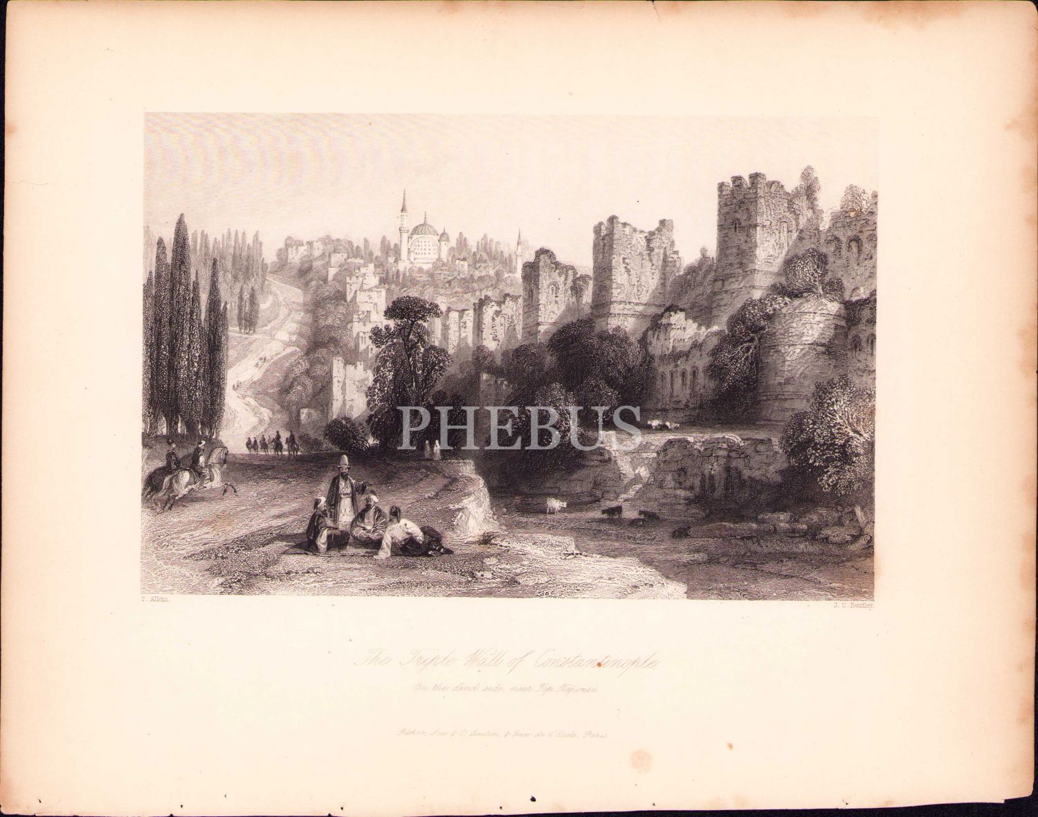 İstanbul Topkapı surları gravürü, T. Allom-J.C. Bentley, Paris baskı, 21x27 cm, bir kenarı yırtık haliyle